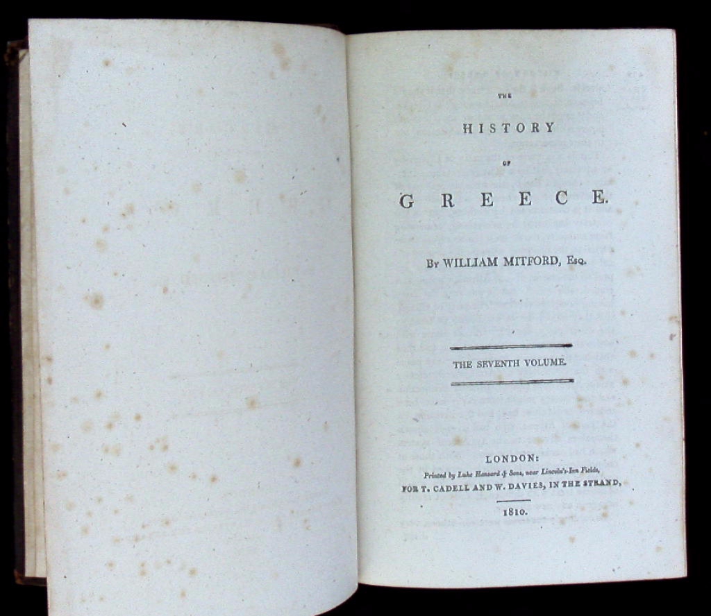 GRIECHENLAND.– MITFORD, William: The history of Greece. Vol. 7. London (Cadell), 1810. VIII, 474 S. Ldr der Zeit mit goldgeprägtem Rücken. Kanten etwas berieben, sonst gutes Ex EA.