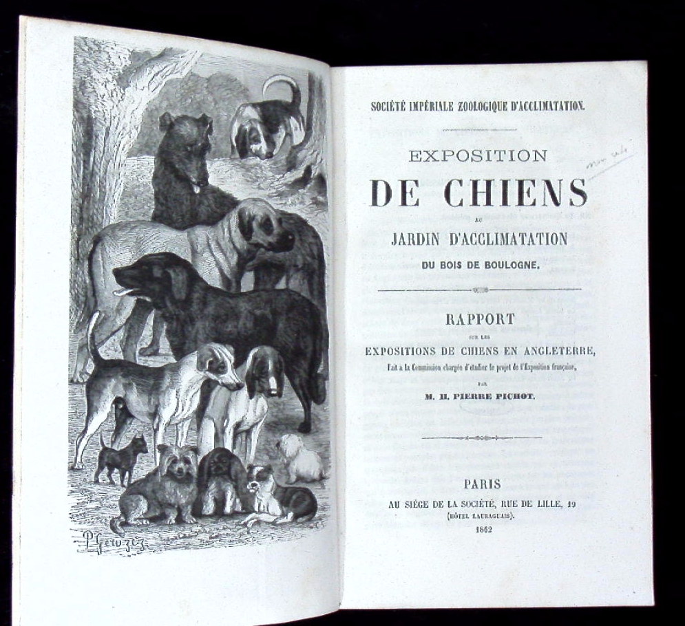 HUNDE.– PICHOT, Pierre: Exposition de Cheins au Jardin d’Acclimation du Bois de Boulogne. Rapport Expositions de Chiens en Angleterre. Paris (Hotel lauraguais), 1862. Gr. 8°. 31 S. mit 1 Titelbild. Br. der Zeit. gutes Ex. EA.
