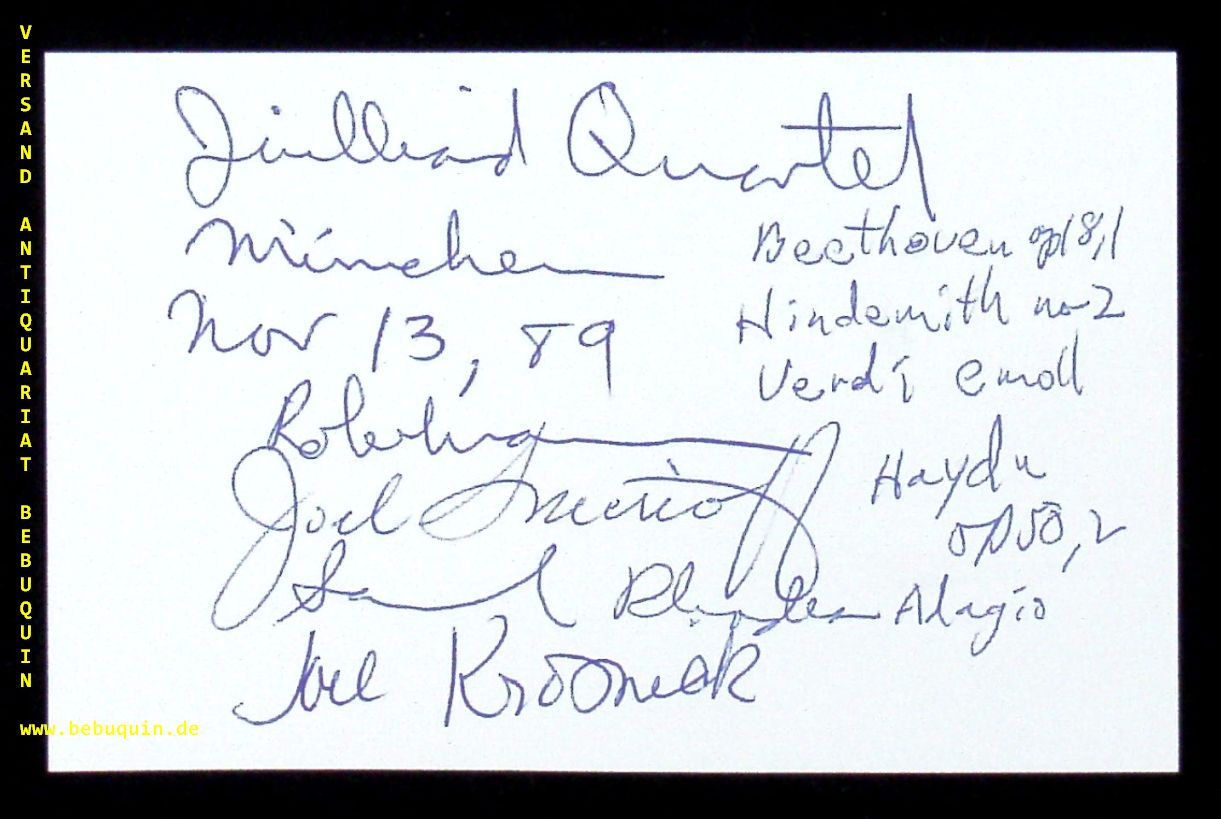 JUILLARD STRING QUARTET.– MANN, Robert + SMIRNOFF, Joel + RHODES, Samuel + KROSNICK, Joel: eigenhändig von allen signierte und datierte Autogrammkarte. München (Philharmonie), 13.11.1989. 8 x 12,5 cm. Karteikarte, Das Juilliard String Quartet gehört seit 1947, dem Jahr seines ersten Auftretens, zu den führenden Streichquartettensembles der Welt. Mit über 100 Veröffentlichungen ist das Juilliard String Quartet eines der am meisten aufgenommenen Streichquartettensembles der Welt und konnte bislang vier Grammys gewinnen. (Wikipedia)