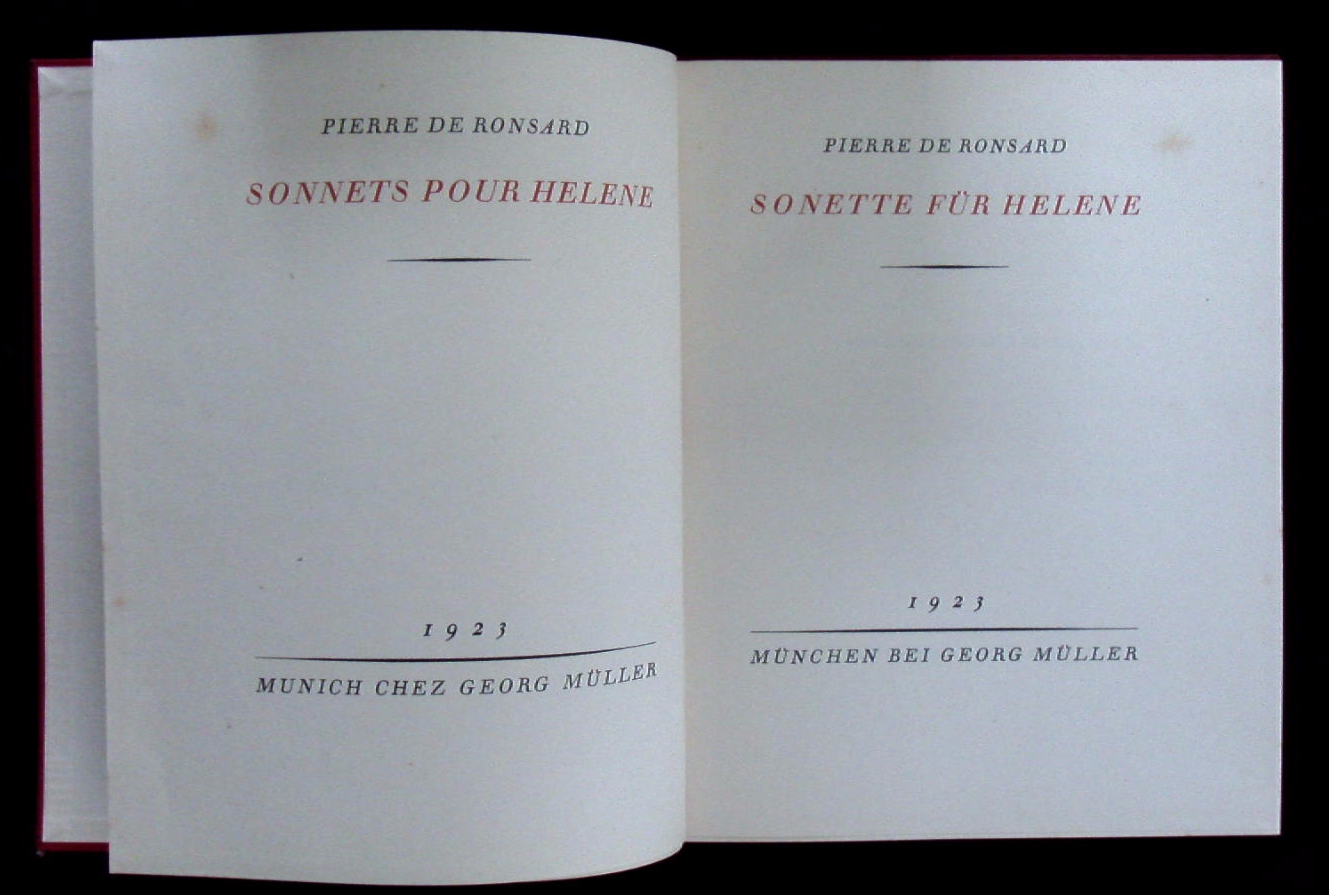 RONSARD, Pierre de: Sonnets pour Helene. = Sonette für Helene. D.v. Irene Kafka. München (Georg Müller), 1923. Gr. 8°. 109 (3) S. OLn mit Goldprägung. Nr. 480 von 650 Ex. dieser Ausgabe.
