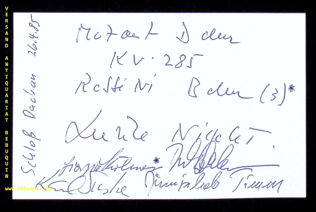 GEWANDHAUS QUARTETT.– NICOLET, Aurele (Flötist) + SUSKE, Karl + KRÖHNER, Giorgio + HALLMANN, Dietmar + TIMM, Jürnjakob. eigenhändig signierte und datierte Autogrammkarte. Dachau (Schloß), 26.4.1985. 8 x 12,5 cm. Karteikarte. Georges Aurèle Nicolet (* 22. Januar 1926 in Neuenburg; † 29. Januar 2016 in Freiburg im Breisgau) war ein Schweizer Flötist. Das Gewandhaus-Quartett (auch: Leipziger Gewandhaus-Quartett) ist ein Streichquartettensemble, das 1808 gegründet wurde. Es war eines der ersten Berufsquartette der Welt. In seiner über 200-jährigen Geschichte oblag ihm die Ehre vieler Uraufführungen. (Wikipedia)