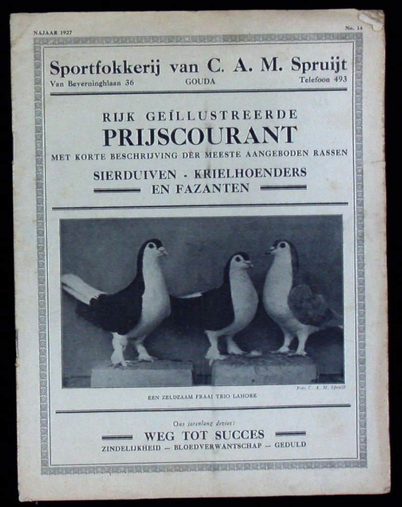TAUBEN.– RIJK GEILLUSTREERDE PRIJSCOURANT.– Met korte Beschrijving der meeste aangeboden Rassen. No. 14 Gouda, 1927. 4°. 16 S. mit zahlr. Abb. ill. OBr. mittige Faltspur, am Rand gebräunt. seltenes reich bebildertes Einzelheft.