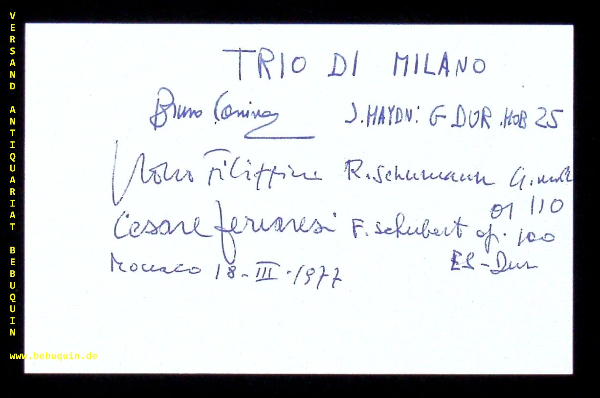 TRIO DI MILANO.– FERRARESI, Cesare (Violinist) + FILIPPINI, Rocco (Cellist) + CANINO, Bruno (Pianist): eigenhändig von allen signierte Autogrammkarte. München (Herkulessaal), 18.3.1977. 8 x 12,5 cm. Karteikarte. Das Trio di Milano wurde 1968 von Bruno Canino, Rocco Filippini und dem 1981 früh verstorbenen Geiger Cesare Ferraresi gegründet. An seine Stelle trat 1985 die aus Rumänien stammende Mariana Sirbu. (Wikipedia)
