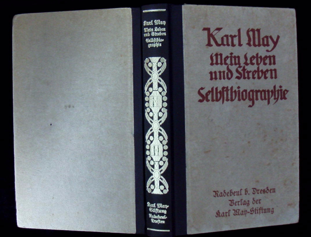 MAY, Karl: Mein Leben und Streben. Selbstbiographie. Hrg. v. Dr. E. Schmid. Mit einem Vorwort zur zweiten Auflage von Klara May. Vorwort zur dritten Auflage von Dr. E. Schmid. Im Anhang: Klara May: Karl Mays letzter Vortrag. 3. Auflage. Radebeul (Karl May Stiftung), (1914). 7 Bl. 261 S. 1 Bl. mit 3 Bildtafeln. OHLdr mit goldgeprägtem Rücken. fein restauriertes Ex. Letzte Ausgabe der Selbstbiographie im Verlag der Karl May Stiftung, der am 1.7. 1913 die Restbestände der 2. Auflage übernommen hatte. NA1.3.