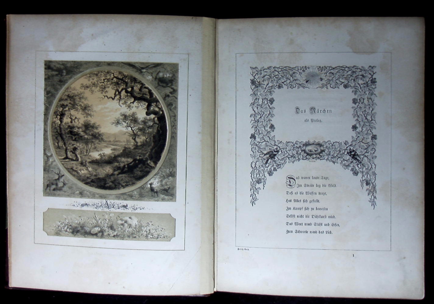 PUTLITZ, Gustav Heinrich Gans zu: Was sich der Wald erzählt. Ein Märchenstrauß. 10. Aufl. Berlin (Duncker), 1852. Gr. 8°. 68 S. mit zahlr. Textabb. + 6 Farbtafeln von A. Hindorf HLdr der Zeit mit goldgeprägtem Rücken. Kanten etwas berieben, Titelseite mit hinterlegtem Eckfehler, Blattränder gebräunt. = Illustrierte Pracht-Ausgabe. Mit einer 4zeiligen eigenhändigen dartierten und voll signierten Verfasserwidmung auf Vorsatz. Gustav Heinrich Gans Edler Herr zu Putlitz (* 20. März 1821 auf Gut Retzin, Prignitz; † 5. September 1890 ebenda) war ein deutscher Gutsbesitzer, Schriftsteller, Theaterintendant und Politiker. Von 1888 bis zu seinem Tod war er Mitglied des Preußischen Herrenhauses. (Wikipedia)