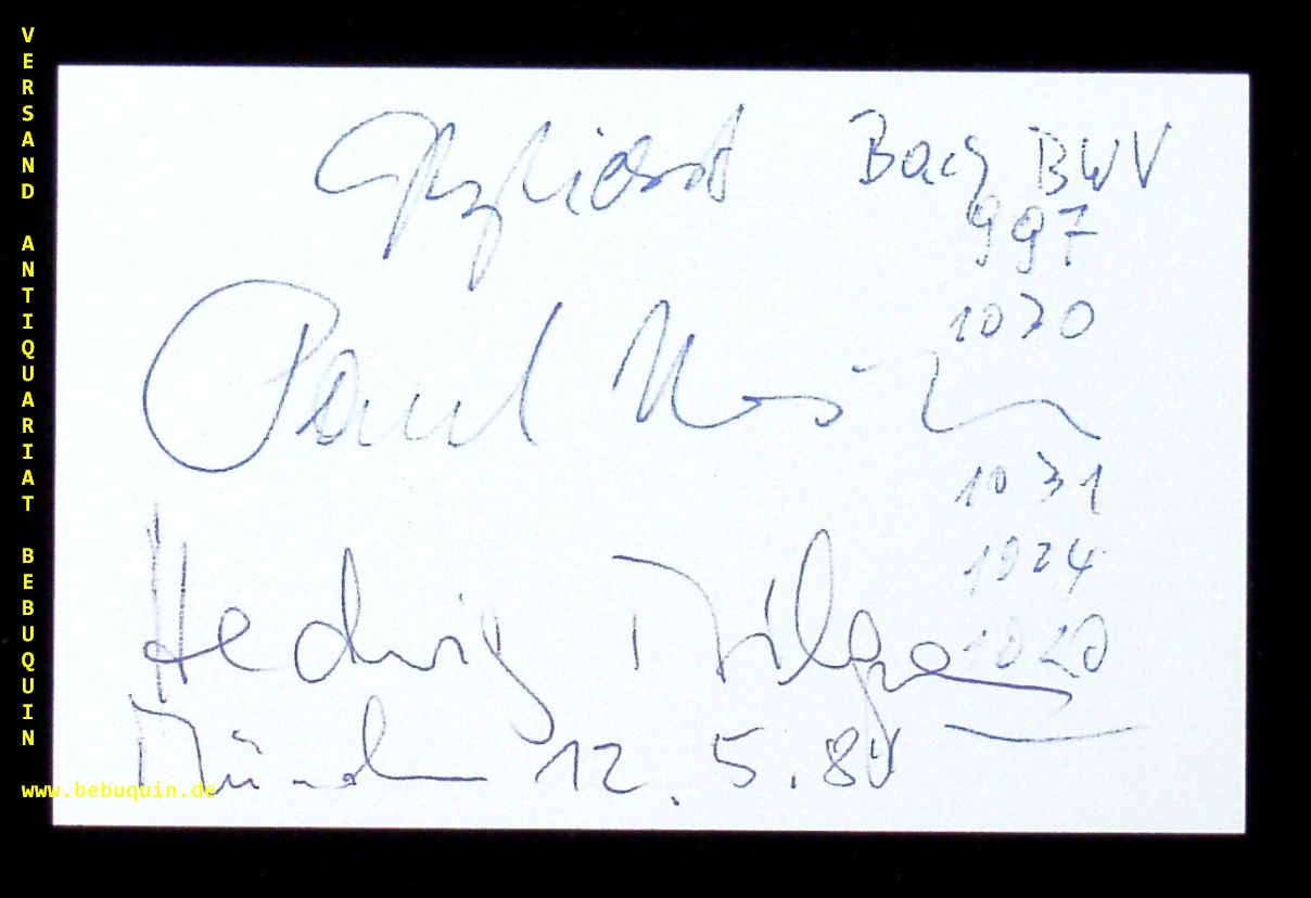 MEISEN, Paul (Flötist) + BILGRAM, Hedwig (Cembalo): eigenhändig von beiden signierte und datierte Autogrammkarte. München, 12.5.1984. 8 x 12,5 cm. Karteikarte. Paul Meisen (* 19. Oktober 1933 in Hamburg; † 23. Juni 2020 in Singenbach) war ein deutscher Flötist und Hochschullehrer. Hedwig Bilgram (* 31. März 1933 in Memmingen) ist eine deutsche Organistin und Cembalistin. Sie war an der Hochschule für Musik und Theater München Professorin für Orgel und Cembalo. (Wikipedia)