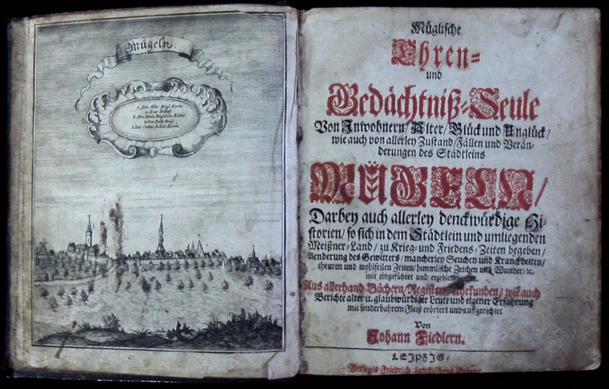 MÜGELN.– FIEDLER, Johann + ZIESSLER, Daniel Otto: Müglische Ehren- und Gedachtnis-Seule von Inwohnern, Alter, Glück und Unglück, wie auch von allerley Zustand, Fällen und Veränderungen des Städtleins Mügeln. Darbey auch allerley denckwürdige Historien, so sich in dem Städtlein und umliegenden Meißner-Land, zu Krieg- und Friedens-Zeiten begeben, Aenderung des Gewitters, macherley Seuchen und Kranckheiten, theuren und wohlfeilen Zeiten, himmlische Zeichen und Wunder etc. mit eingeführet und erzehlet werden. Aus allerhand Büchern, Registern, Uhrkunden, wie auch Berichte alter u. glaubwürdiger Leute und eigener Erfahrung mit sonderbahrem Fleiß erörtert und auffgerichtet. 2 Teile in 1 Bd. Leipzig (Lanckisch Erben), 1709. 7 Bl., 216, 167 S.; 8 Bl. mit 2 gestochenen Frontispizes. Ldr der Zeit auf 5 falschen Bünden. Einband stärker beschabt, Vorsatz angeschmutzt. Durchgängig braun- und fingerfleckig, Wurmspuren (selten Buchstabenverlust). Bemmann-Jatzwauk III/2, 47. – Zweite Ausgabe der Fiedlerschen Chronik von Mügeln, die zuerst 1652 erschienen war. Hier mit einer Fortsetzung von Daniel Otto Zießler (1666-1724) versehen, die mit eigenem Titelblatt angefügt ist: “Historische und andere Begebenheiten der Müglischen Ehren- und Gedächtniß-Seule […] zusammen getragen, zur Continuation und Fortsetzung solcher der Müglischen Chronica, von Anno 1652. biß 1708.” – Johann Fiedler (1612-1672), Theologe und Poet aus Reichenbach im Vogtland, war von 1638 bis 1658 Diakon in Mügeln. – Das erste Frontispiz mit einer Gesamtansicht von Mügeln.
