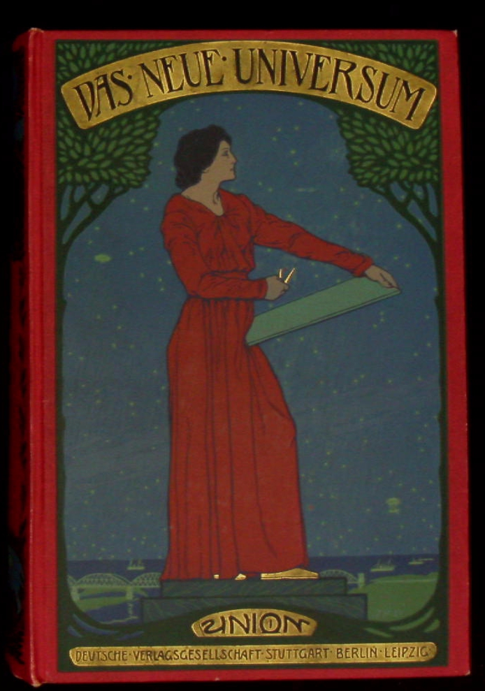 DAS NEUE UNIVERSUM. Die interessantesten Erfindungen und Entdeckungen auf allen Gebieten, sowie Reiseschilderungen, Erzählungen, Jagden und Abenteuer. Stuttgart (Union), (1908). VI, 473 S. mit sehr zahlr. z.T. farb. Abb. im Text + auf Tafeln. ill. OLn. Titelbild mit hinterlegtem Einriss, sonst sehr gut. = Bd. 29. Das Neue Universum war eine Jugendbuchreihe. Ab 1880 erschien jährlich ein Band mit Themen aus den Bereichen Wissen, Forschung, Abenteuer, Unterhaltung. In den Jahren 1943 sowie 1945 bis 1947 wurden keine Bände veröffentlicht. 1958 erschien der Jubiläumsband 75. Im Jahr 2002 erschien nach 122 Jahren der letzte Band mit Nummer 119. Die Bände 1 bis 11 erschienen im W. Spemann Verlag, Stuttgart; die Bände 12 bis 90 im Union Verlag Deutsche Verlagsgesellschaft, Stuttgart-Berlin-Leipzig; die Bände 91 bis 119 im Südwest-Verlag, München. Außer Sachthemen druckte das Neue Universum auch fiktionale Texte. Bekannte Autoren wie Isaac Asimov und Hans Dominik und viele andere veröffentlichten so ihre Science-Fiction-Kurzgeschichten im Neuen Universum. Dabei zeichnen sich Themenwahl und inhaltliche Gestaltung durch einen starken Zukunfts-, Wissenschafts- und Machbarkeitsoptimismus aus. In den Jugendstilbänden hieß es im Untertitel: Ein Jahrbuch für Haus und Familie, besonders für die reifere Jugend, mit einem Anhang zur Selbstbeschäftigung „häusliche Werkstatt“. Später lautete der Untertitel des Jahrbuches „Ein Jahrbuch des Wissens und Fortschritts“, ab 1970 wurde es umbenannt in „Forschung, Wissen, Unterhaltung. Ein Jahrbuch“, ab 1985 hieß es „Ein Jahrbuch für Forschung, Wissen, Unterhaltung“. (Wikepedia)