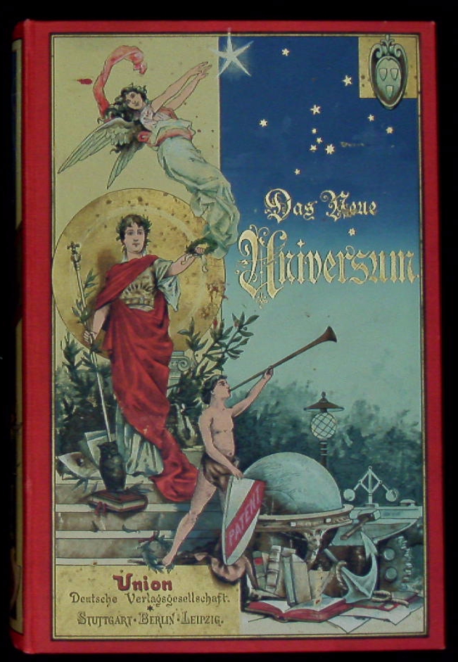 DAS NEUE UNIVERSUM. Die interessantesten Erfindungen und Entdeckungen auf allen Gebieten. Ein Jahrbuch für Haus und Familie, besonders für die reifere Jugend. Stuttgart (Union), 1897. 396 S. mit zahlr. Textabb. + getönten Bildtafeln, sowie 1 Falttitelblatt. farb. ill. OLn. feines Ex. = Bd. 18. Das Neue Universum war eine Jugendbuchreihe. Ab 1880 erschien jährlich ein Band mit Themen aus den Bereichen Wissen, Forschung, Abenteuer, Unterhaltung. In den Jahren 1943 sowie 1945 bis 1947 wurden keine Bände veröffentlicht. 1958 erschien der Jubiläumsband 75. Im Jahr 2002 erschien nach 122 Jahren der letzte Band mit Nummer 119. Die Bände 1 bis 11 erschienen im W. Spemann Verlag, Stuttgart; die Bände 12 bis 90 im Union Verlag Deutsche Verlagsgesellschaft, Stuttgart-Berlin-Leipzig; die Bände 91 bis 119 im Südwest-Verlag, München. Außer Sachthemen druckte das Neue Universum auch fiktionale Texte. Bekannte Autoren wie Isaac Asimov und Hans Dominik und viele andere veröffentlichten so ihre Science-Fiction-Kurzgeschichten im Neuen Universum. Dabei zeichnen sich Themenwahl und inhaltliche Gestaltung durch einen starken Zukunfts-, Wissenschafts- und Machbarkeitsoptimismus aus. In den Jugendstilbänden hieß es im Untertitel: Ein Jahrbuch für Haus und Familie, besonders für die reifere Jugend, mit einem Anhang zur Selbstbeschäftigung „häusliche Werkstatt“. Später lautete der Untertitel des Jahrbuches „Ein Jahrbuch des Wissens und Fortschritts“, ab 1970 wurde es umbenannt in „Forschung, Wissen, Unterhaltung. Ein Jahrbuch“, ab 1985 hieß es „Ein Jahrbuch für Forschung, Wissen, Unterhaltung“. (Wikepedia)