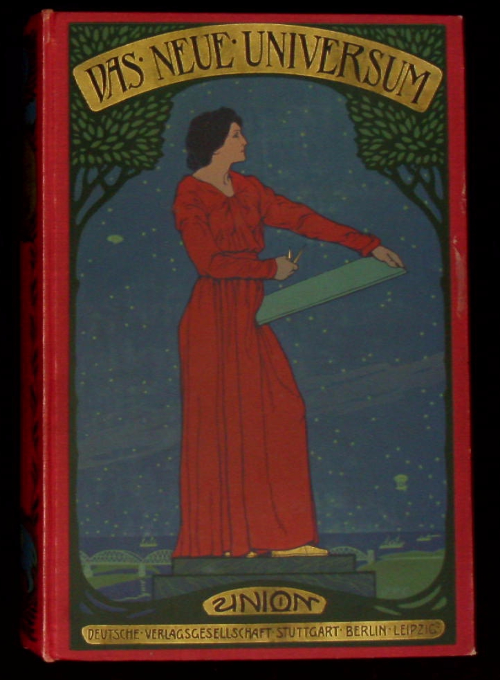 DAS NEUE UNIVERSUM. Die interessantesten Erfindungen und Entdeckungen auf allen Gebieten, sowie Reiseschilderungen, Erzählungen, Jagden und Abenteuer. Stuttgart (Union), (1907). VI, 473 (5) S. mit sehr zahlr. z.T. farb. Abb. im Text + auf Tafeln. ill. OLn. Falttafel mit Minieinriss, sonst sehr schönes Ex. = Bd. 28. Das Neue Universum war eine Jugendbuchreihe. Ab 1880 erschien jährlich ein Band mit Themen aus den Bereichen Wissen, Forschung, Abenteuer, Unterhaltung. In den Jahren 1943 sowie 1945 bis 1947 wurden keine Bände veröffentlicht. 1958 erschien der Jubiläumsband 75. Im Jahr 2002 erschien nach 122 Jahren der letzte Band mit Nummer 119. Die Bände 1 bis 11 erschienen im W. Spemann Verlag, Stuttgart; die Bände 12 bis 90 im Union Verlag Deutsche Verlagsgesellschaft, Stuttgart-Berlin-Leipzig; die Bände 91 bis 119 im Südwest-Verlag, München. Außer Sachthemen druckte das Neue Universum auch fiktionale Texte. Bekannte Autoren wie Isaac Asimov und Hans Dominik und viele andere veröffentlichten so ihre Science-Fiction-Kurzgeschichten im Neuen Universum. Dabei zeichnen sich Themenwahl und inhaltliche Gestaltung durch einen starken Zukunfts-, Wissenschafts- und Machbarkeitsoptimismus aus. In den Jugendstilbänden hieß es im Untertitel: Ein Jahrbuch für Haus und Familie, besonders für die reifere Jugend, mit einem Anhang zur Selbstbeschäftigung „häusliche Werkstatt“. Später lautete der Untertitel des Jahrbuches „Ein Jahrbuch des Wissens und Fortschritts“, ab 1970 wurde es umbenannt in „Forschung, Wissen, Unterhaltung. Ein Jahrbuch“, ab 1985 hieß es „Ein Jahrbuch für Forschung, Wissen, Unterhaltung“. (Wikepedia)