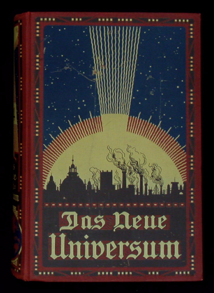 DAS NEUE UNIVERSUM. Die interessantesten Erfindungen und Entdeckungen auf allen Gebieten, sowie Reiseschilderungen, Erzählungen, Jagden und Abenteuer. Stuttgart (Union), (1913). VI, 473 (9) S. mit sehr zahlr. z.T. farb. Abb. im Text + auf Tafeln und das gefaltete farbige Vorschaltbild (″Das Flugzeug im Zukunftskrieg“). ill. OLn. Deckel leicht bekratzt, Titelbild an den Falzen hinterlegt, sonst gut erhalten. = Bd. 34. Das Neue Universum war eine Jugendbuchreihe. Ab 1880 erschien jährlich ein Band mit Themen aus den Bereichen Wissen, Forschung, Abenteuer, Unterhaltung. In den Jahren 1943 sowie 1945 bis 1947 wurden keine Bände veröffentlicht. 1958 erschien der Jubiläumsband 75. Im Jahr 2002 erschien nach 122 Jahren der letzte Band mit Nummer 119. Die Bände 1 bis 11 erschienen im W. Spemann Verlag, Stuttgart; die Bände 12 bis 90 im Union Verlag Deutsche Verlagsgesellschaft, Stuttgart-Berlin-Leipzig; die Bände 91 bis 119 im Südwest-Verlag, München. Außer Sachthemen druckte das Neue Universum auch fiktionale Texte. Bekannte Autoren wie Isaac Asimov und Hans Dominik und viele andere veröffentlichten so ihre Science-Fiction-Kurzgeschichten im Neuen Universum. Dabei zeichnen sich Themenwahl und inhaltliche Gestaltung durch einen starken Zukunfts-, Wissenschafts- und Machbarkeitsoptimismus aus. In den Jugendstilbänden hieß es im Untertitel: Ein Jahrbuch für Haus und Familie, besonders für die reifere Jugend, mit einem Anhang zur Selbstbeschäftigung „häusliche Werkstatt“. Später lautete der Untertitel des Jahrbuches „Ein Jahrbuch des Wissens und Fortschritts“, ab 1970 wurde es umbenannt in „Forschung, Wissen, Unterhaltung. Ein Jahrbuch“, ab 1985 hieß es „Ein Jahrbuch für Forschung, Wissen, Unterhaltung“. (Wikepedia)