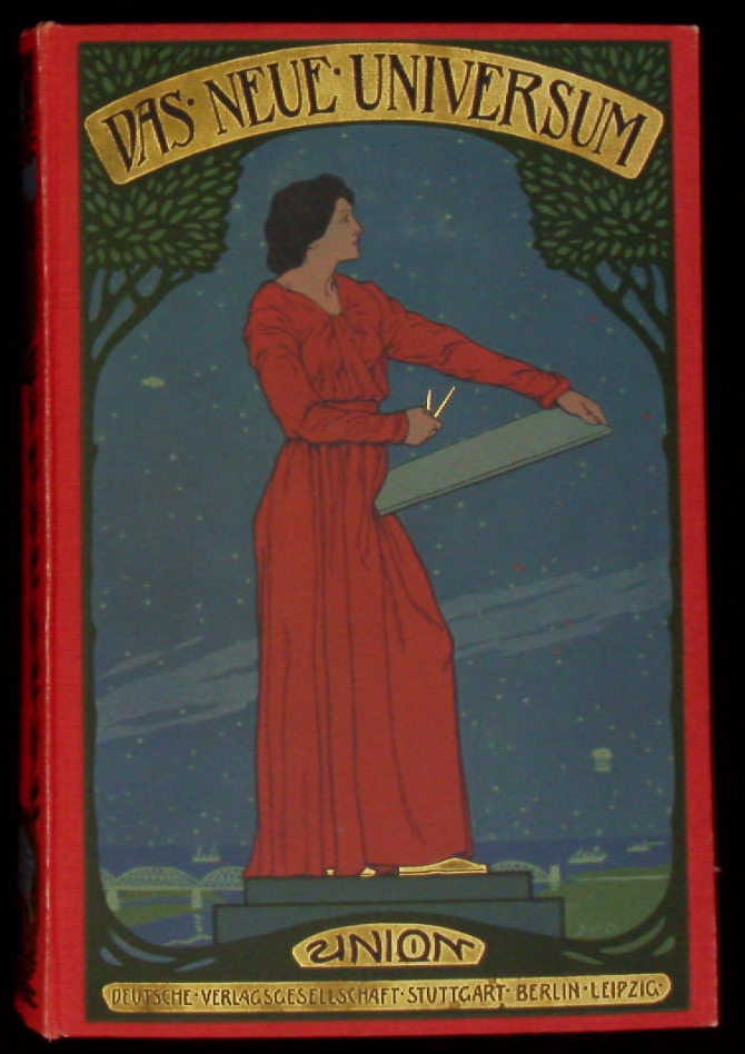 DAS NEUE UNIVERSUM. Die interessantesten Erfindungen und Entdeckungen auf allen Gebieten, sowie Reiseschilderungen, Erzählungen, Jagden und Abenteuer. Stuttgart (Union), 1902. 474 S. mit sehr zahlr. z.T. farb. Abb. im Text + auf Tafeln sowie der farbigen Falttafel „Schnellzuglokomotive der Sächsischen Eisenbahn“. ill. OLn. feines Ex. = Bd. 23. Das Neue Universum war eine Jugendbuchreihe. Ab 1880 erschien jährlich ein Band mit Themen aus den Bereichen Wissen, Forschung, Abenteuer, Unterhaltung. In den Jahren 1943 sowie 1945 bis 1947 wurden keine Bände veröffentlicht. 1958 erschien der Jubiläumsband 75. Im Jahr 2002 erschien nach 122 Jahren der letzte Band mit Nummer 119. Die Bände 1 bis 11 erschienen im W. Spemann Verlag, Stuttgart; die Bände 12 bis 90 im Union Verlag Deutsche Verlagsgesellschaft, Stuttgart-Berlin-Leipzig; die Bände 91 bis 119 im Südwest-Verlag, München. Außer Sachthemen druckte das Neue Universum auch fiktionale Texte. Bekannte Autoren wie Isaac Asimov und Hans Dominik und viele andere veröffentlichten so ihre Science-Fiction-Kurzgeschichten im Neuen Universum. Dabei zeichnen sich Themenwahl und inhaltliche Gestaltung durch einen starken Zukunfts-, Wissenschafts- und Machbarkeitsoptimismus aus. In den Jugendstilbänden hieß es im Untertitel: Ein Jahrbuch für Haus und Familie, besonders für die reifere Jugend, mit einem Anhang zur Selbstbeschäftigung „häusliche Werkstatt“. Später lautete der Untertitel des Jahrbuches „Ein Jahrbuch des Wissens und Fortschritts“, ab 1970 wurde es umbenannt in „Forschung, Wissen, Unterhaltung. Ein Jahrbuch“, ab 1985 hieß es „Ein Jahrbuch für Forschung, Wissen, Unterhaltung“. (Wikepedia)