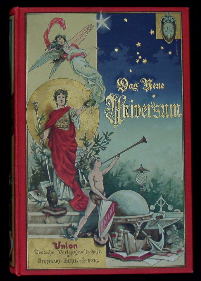 DAS NEUE UNIVERSUM. Die interessantesten Erfindungen und Entdeckungen auf allen Gebieten. Ein Jahrbuch für Haus und Familie, besonders für die reifere Jugend. Stuttgart (Union), 1898. 396 S. mit zahlr. Textabb. + getönten Bildtafeln, sowie 1 Falttitelblatt des Panzerkreuzers Bosmarck und ungeöffnetem Lösungsblatt im Rückdeckel. farb. ill. OLn. sehr schönes Ex. = Bd. 19. Das Neue Universum war eine Jugendbuchreihe. Ab 1880 erschien jährlich ein Band mit Themen aus den Bereichen Wissen, Forschung, Abenteuer, Unterhaltung. In den Jahren 1943 sowie 1945 bis 1947 wurden keine Bände veröffentlicht. 1958 erschien der Jubiläumsband 75. Im Jahr 2002 erschien nach 122 Jahren der letzte Band mit Nummer 119. Die Bände 1 bis 11 erschienen im W. Spemann Verlag, Stuttgart; die Bände 12 bis 90 im Union Verlag Deutsche Verlagsgesellschaft, Stuttgart-Berlin-Leipzig; die Bände 91 bis 119 im Südwest-Verlag, München. Außer Sachthemen druckte das Neue Universum auch fiktionale Texte. Bekannte Autoren wie Isaac Asimov und Hans Dominik und viele andere veröffentlichten so ihre Science-Fiction-Kurzgeschichten im Neuen Universum. Dabei zeichnen sich Themenwahl und inhaltliche Gestaltung durch einen starken Zukunfts-, Wissenschafts- und Machbarkeitsoptimismus aus. In den Jugendstilbänden hieß es im Untertitel: Ein Jahrbuch für Haus und Familie, besonders für die reifere Jugend, mit einem Anhang zur Selbstbeschäftigung „häusliche Werkstatt“. Später lautete der Untertitel des Jahrbuches „Ein Jahrbuch des Wissens und Fortschritts“, ab 1970 wurde es umbenannt in „Forschung, Wissen, Unterhaltung. Ein Jahrbuch“, ab 1985 hieß es „Ein Jahrbuch für Forschung, Wissen, Unterhaltung“. (Wikepedia)