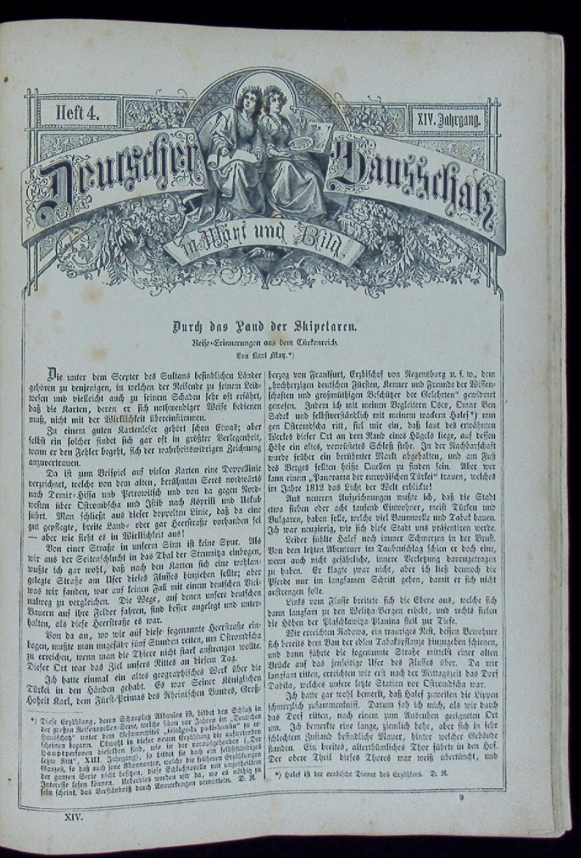 MAY, Karl: Durch das Land der Skipetaren. Reiseerinnerungen aus dem Türkebnreich. In: Deutscher Hausschatz in Wort und Bild. 2 Bände. Regensburg (Pustet), 1887/1888. 4°. ca 800 S. mit zahlreichen Holzstichen. HLn der Zeit. Ecken teils angeplatzt, Vorsätze fingerspurig, vereinzelt leicht braunfleckig, sonst sehr gutes Ex. = 14. Jg. EA. Plaul 190.