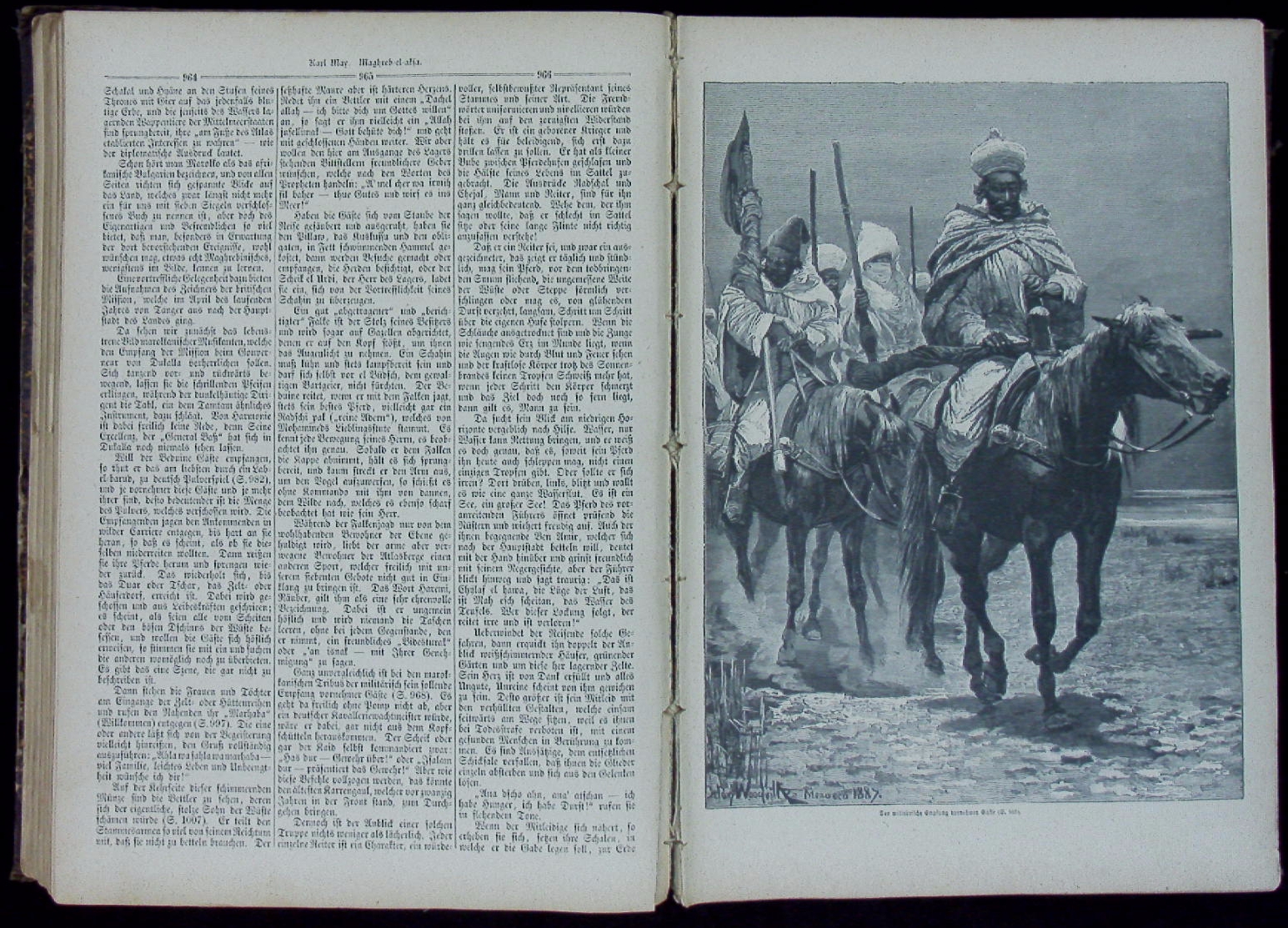 MAY, Karl: Maghreb-el-aksa. In: Vom Fels zum Meer. Spemann’s Illustrire Zeitung für das Deutsche Haus. Stuttgart (Spemann), 1887/88. 4°. 2016 Spalten mit zahlreichen Holzstichen (davon 7 Spalten von Karl May und 4 ganzseitige Illustrationen, die oft fehlen, von C. Woodville). HLn der Zeit. Ecken teils angeplatzt, Vorsätze fingerspurig, kaum gelockert. = 7. Jg. EA erschinen November 1887. Plaul 189.