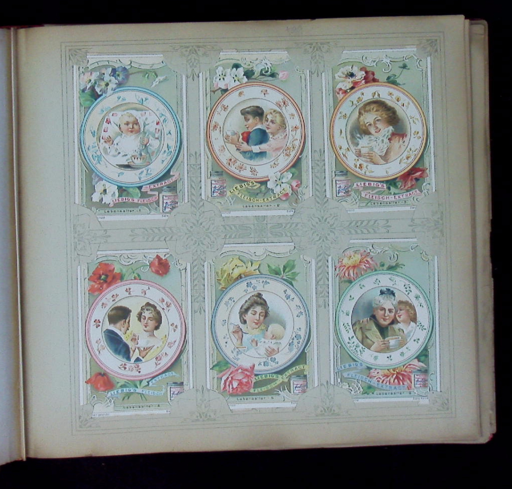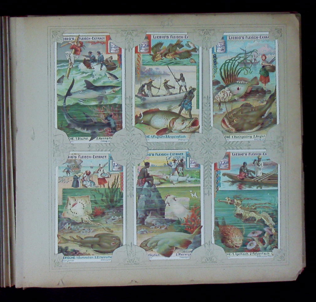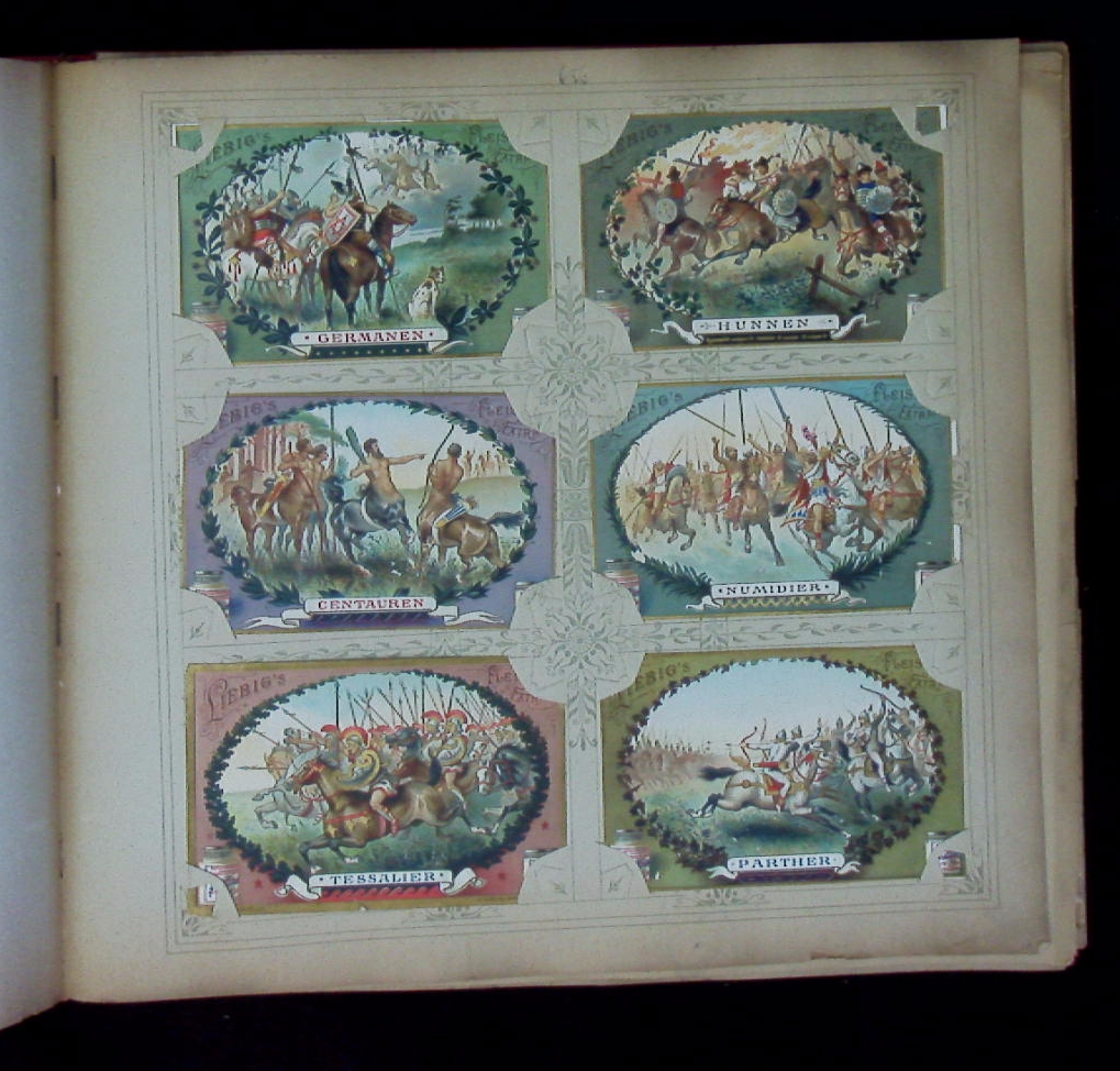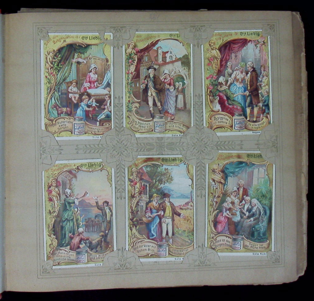 SAMMELBILDERALBEN.– LIEBIG.– Album mit Sammelbildern. Hamburg, (Liebig Company’s Fleisch-Extract), ca 1890 – 1920. Quer 4°. 79 Serien mit über 470 farb. Sammelbildern. Original Leinenalbum mit relativ seltener farbiger Einbandgestaltung mit Vogel und Schmetterling. Album in ordentlicher Außenerhaltung, innen stark lädiert mit vielen losen Seiten und zahlreichen eingerissenen Laschen. Die Bilder fast ausschließlich von guter Erhaltung. Folgende Serien sind vorhanden: 334 (25,–), 614, 445, 793 (40,–), 668, 249, 542, 522, 184 (20,–), 287, 524, 454, 278 (65,–), 667, 386, 298 (35,–), 391, 485, 253, 353, 501, 505 (30,–), 554, 289, 536, 576, 566, 580, 573, 510, 518 (45,–), 538, 558, 545, 194 (40,–), 303, 420, 708, 598, 535, 586, 599, 235 (35,–), 311, 282, 532, 533, 168 (45,–), 590, 530, 596, 592, 615, 525, 656, 616 (2), 617, 570, 526, 620, 553, 578, 288, 481, 559 (25,–), 513, 550, 371, 671, 518 (45,–), 496, 628, 679, 579, 649, 221 (40,–), 659, 506, 621 (In Klammern sind die jeweils fehlenden Bilder aufgeführt bzw. die Preise laut Liste).