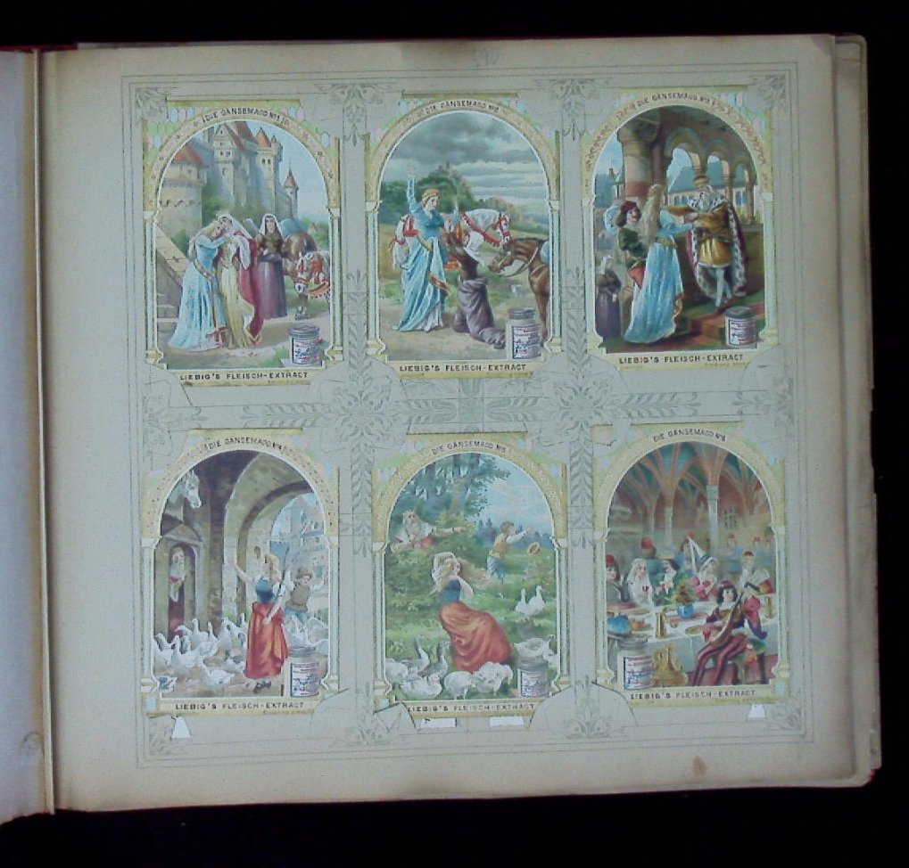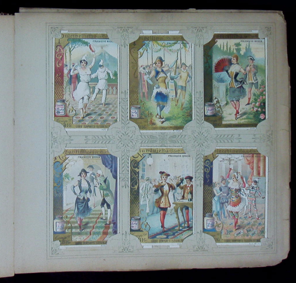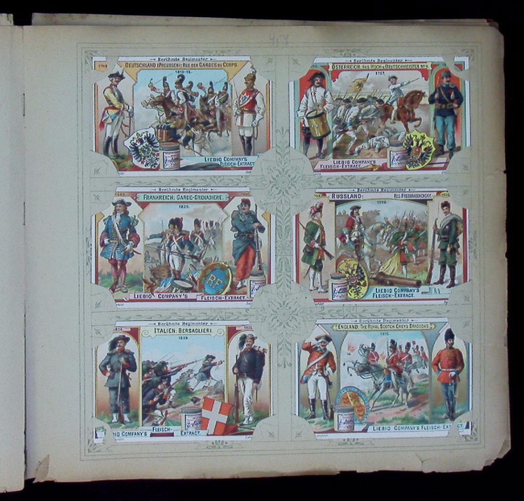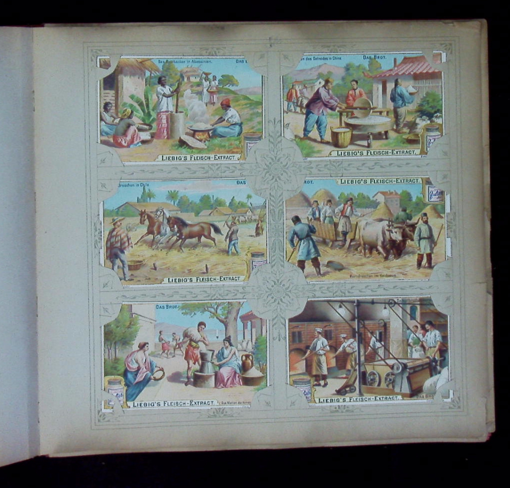SAMMELBILDERALBEN.– LIEBIG.– Album mit Sammelbildern. Hamburg, (Liebig Company’s Fleisch-Extract), ca 1890 – 1920. Quer 4°. 79 Serien mit über 470 farb. Sammelbildern. Original Leinenalbum mit relativ seltener farbiger Einbandgestaltung mit Vogel und Schmetterling. Album in ordentlicher Außenerhaltung, innen stark lädiert mit vielen losen Seiten und zahlreichen eingerissenen Laschen. Die Bilder fast ausschließlich von guter Erhaltung. Folgende Serien sind vorhanden: 334 (25,–), 614, 445, 793 (40,–), 668, 249, 542, 522, 184 (20,–), 287, 524, 454, 278 (65,–), 667, 386, 298 (35,–), 391, 485, 253, 353, 501, 505 (30,–), 554, 289, 536, 576, 566, 580, 573, 510, 518 (45,–), 538, 558, 545, 194 (40,–), 303, 420, 708, 598, 535, 586, 599, 235 (35,–), 311, 282, 532, 533, 168 (45,–), 590, 530, 596, 592, 615, 525, 656, 616 (2), 617, 570, 526, 620, 553, 578, 288, 481, 559 (25,–), 513, 550, 371, 671, 518 (45,–), 496, 628, 679, 579, 649, 221 (40,–), 659, 506, 621 (In Klammern sind die jeweils fehlenden Bilder aufgeführt bzw. die Preise laut Liste).