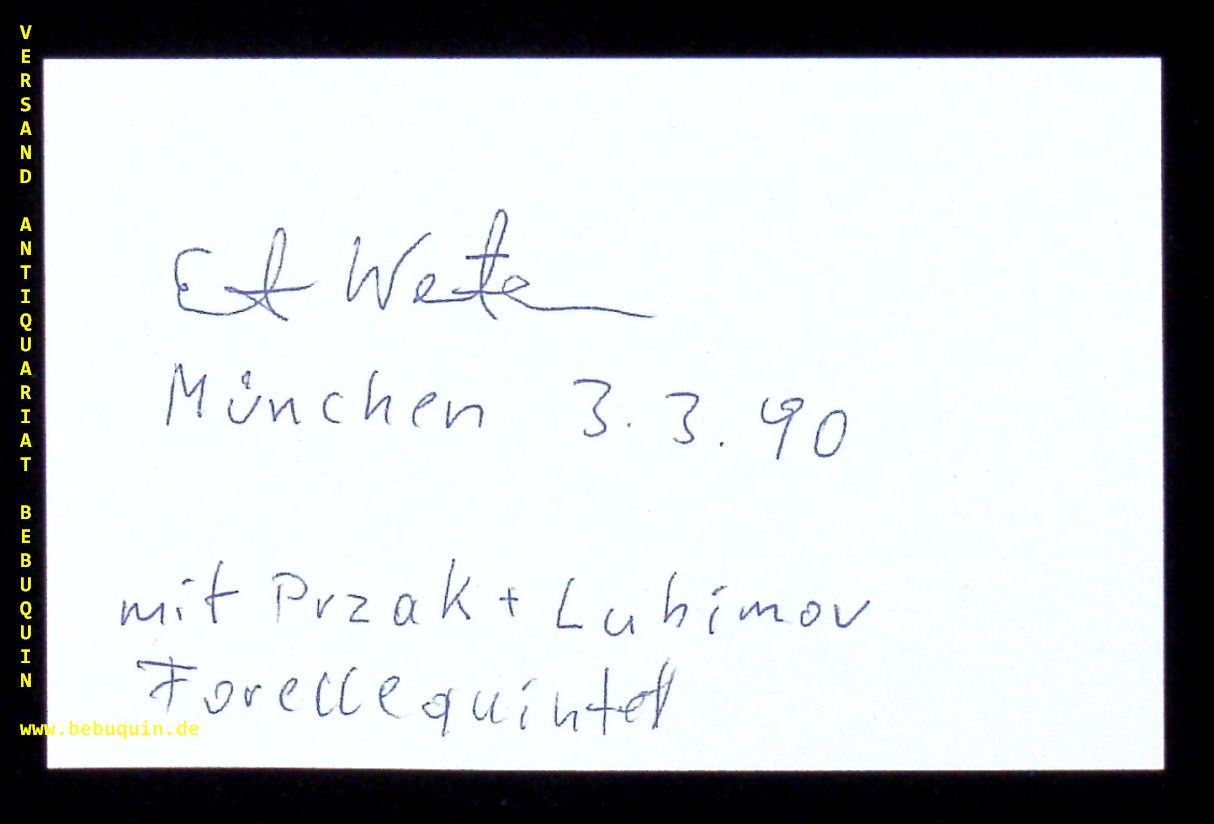 WEISSENSTEINER, ERnst (Bassist): eigenhändig signierte und datierte Autogrammkarte. München (Philharmonie), 3.3.1990. 8 x 12,5 cm. Karteikarte. Ernst Weissensteiner (geboren 1965), Solobassist der Wiener Symphoniker und Leiter einer Kontrabassklasse an der Konservatorium Wien Privatuniversität, erhielt seine musikalische Ausbildung an der Universität für Musik in Wien bei Ludwig Streicher. 1989 erhielt er sein Diplom mit Auszeichnung sowie die Zuerkennung eines Würdigungspreises durch das Bundesministerium für Wissenschaft und Kunst. Regelmäßige Konzerttätigkeit mit dem Klangforum Wien, Chamber Orchestra of Europe, Vienna Art Orchestra und Konzerte mit Joe Zawinul, Ingrid Janson, Tatiana Grintenko, Alexei Lubimov, Nigel Kennedy, dem Vienna Symphony Jazz Project, Vienna Bass&oon Quartet, Dolby`s Around und dem Kontrabass Sextett Bass Instinct zeugen von stilistischer Lebendigkeit. Viele zeitgenössische Komponisten vertrauen ihm ihre Kompositionen an, um sie von seiner spieltechnischen Meisterschaft und seinem Interesse an neuer Musik aus der Taufe heben zu lassen. (Musik Graz)