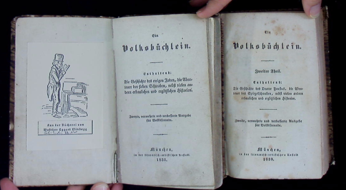 AURBACHER, Ludwig: Ein Volksbüchlein. Erster Theil enthaltend: Die Geschichte des ewigen Juden, die Abenteuer der sieben Schwaben, nebst vielen andern erbaulichen und ergötzlichen Historien. Zweiter Theil enthaltend: Die Geschichte des Doctor Faustus, die Abenteuer des Spiegelschwaben, nebst vielen andern erbaulichen und ergötzlichen Historien. 2., verm. und verb. Ausg. für Volksfreunde. 2 Bände. München (Literar.-artist. Anst.). 1835 + 1839. kl. 8°. IV, 312, IV, 348 S. Pb der Zeit. Gelenke kaum gelockert, etwas stokfleckig, insgesamt gut. EA WG² 40.