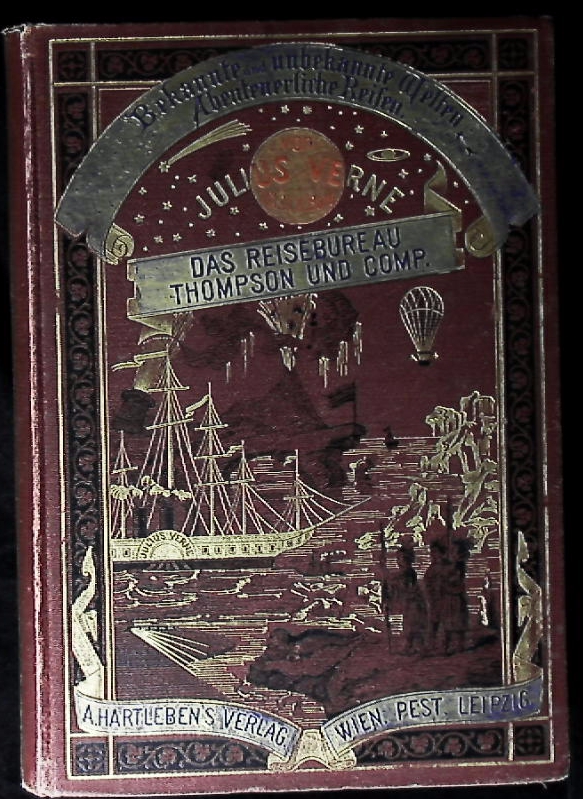 VERNE, Julius: Das Reisebureau Thompson und Comp. 2 Teile in 1 Bd. Wien (Hartleben), 1909. Gr. 8°. 487 S. mit 61 Illustrationen. OLn. mit reicher Gold- und Schwarzprägung sowie Farbschnitt. Kanten etwas berieben, Vorsätze leicht gebräunt, sonst sehr gut erhalten. = Bekannte und unbekannte Welten, Bd. 91-92. dt. EA. Prachtausgabe. Fromm 26376.