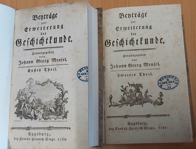 MEUSEL, Johann Georg: (Hrsg.) Beyträge zur Erweiterung der Geschichtkunde. 2 Bände (so komplett). Augsburg (Stage), 1780-1782. 6 Bll., 308; 4 Bll., 311 (1) S. mit zwei gestochenen Titelvignetten (in Band 1 von Jacob Andreas Fridrich nach G. Eichler). neue mamorierte Pb. innen nur vereinzelt braunfleckig, gutes Ex. EA Diesch 315. Hamberger/Meusel V, 196. Kirchner I, 1105. Enthält im ersten Band: 1. Historische Abhandlung von dem Münzwesen der Reichsstadt Augsburg (S. 1-53). 2. Vom Gau Tullifeld (S. 54-85). 3. Eines Kayserlichen Hoffraths Bedenkhen, daß Ihr Kay. May. den auffstand in Böheim (Böhmen) 1618. nicht per arma, sondern durch gütige weg stillen sollen (S. 86-111). 4. Wie Hertzog Buchsloff von Bomern (Pommern) mit Marggraf Albrechten zu Krieg kam, (S. 112- 115). 5. Die Pommerschen Herzoge Otto und Wartislaff IV. vergleichen sich. (S. 115-118). 6. Beschreibung der Buräten, oder nach Rußischer Mundart Bratsky, eines unter Rußischer Bothmäßigkeit stehenden Tatarischen Volkes. (S. 119-180). 7. Historische Anecdoten und Berichtigungen (S. 181-188). 8. Diplomatischer Beytrag zur Geschichte des Klosters Seligenthal (S. 189-230). 9. Neue Sammlung zur Geschichte Herzog Ulrichs von Würtemberg (S. 231-308). – Im zweiten Band: I. Johann Gottlob Boehmens Beyträge zur Sächsischen Geschichte. (S. 1-78). II. Versuch zu Bestimmung der. Erwählung- und Krönungstage Siegmunds, (S. 79-94). III. Nähere Untersuchung des Alters der Bücherprivilegien (S. 95-114). IV. Grundzüge einer älteren Erdbeschreibung der Niederlande; oder Geschichte Ihrer Flüsse. (S. 115-132). V. Von den ausgestorbenen Grafen von Wilnau oder Wilnowe (S. 133-142). VI. Beytrag zur Geschichte Pabsts Julius des Dritten (S. 143-154). VII. Zwote Abhandlung über die Geschichte des. Hauses Luxenburg (S. 155-282) VIII. Einige Anekdoten von. Johann Georg von Eckhart (S. 283-290). IX. Von der Stadt und Landeshauptmannschaft Hof unter den Carolingischen, Fränkischen und Sächsischen Kaisern (S. 291-298). X. Bescheinigungssätze, daß in Stadt und Amt, oder in der Herrschaft Römhild, (S. 299-311). – Der Historiker Meusel (1743-1820) ist vor allem durch seine lexikalischen Werke und Periodika bekannt. „Weite Anerkennung fand er jedoch bereits zu Lebzeiten als Lexikograph und Bibliograph. Das hier von ihm Geschaffene hat bis heute seinen Wert behalten“ (NDB 17, 274 f.). Die vorliegenden „Beyträge“, eine Fortführung seiner Reihe „Der Geschichtforscher“, sind nur noch selten zu finden.
