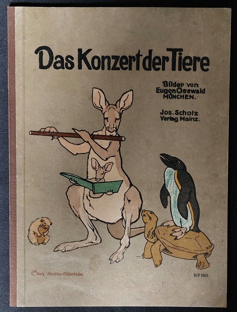 SCHOLZ KÜNSTLER BILDERBÜCHER.– OSSWALD, Eugen: Das Konzert der Tiere. Mainz, (Jos. Scholz), 1922. 4“. 4 Bl. mit 8 farblithogr. Bildtafeln von Osswald. farb. ill. OHln. Pinguin auf Einband ausgemalt sonst gutes Ex. = Scholz’ Künstler-Bilderbücher No 160.