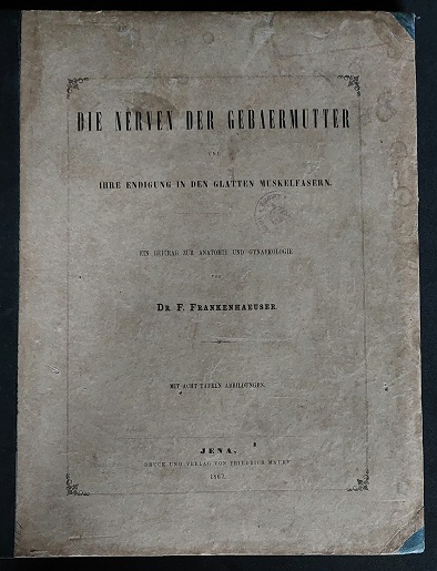 MEDIZIN.– FRANKENHÄUSER, Fritz: Die Nerven der Gebärmutter und ihre Endigung in den glatten Muskelfasern. Ein Beitrag zur Anatomie und Gynäkologie. Jena (Mauke), 1867. Fol. IV, 82 S. + 8 teilkolorierte ganzseitige Tafeln. OHLn. Einband gebräunt und fingerspurig, sonst gute Erhaltung. Einzige Ausgabe der Arbeit über die Nerven des Uterus von Ferdinand Frankenhäuser, nach dem der Frankenhäuser Plexus benannt ist! Die sehr feinen Tafeln wurden von Frankenhaeuser selbst nach der Natur gezeichnet und von A. Schütze vom Lith. Institut Berlin lithografiert. Ferdinand Frankenhäuser, „Gynäkologe, war Schüler und Assistent von Ed. Martin in Jena, wurde um 1860 Privatdozent in Jena, 1869 Extraordinarius daselbst, 1872 ord. Prof. in Zürich, wo er bis 1888 blieb, um sich dann nach Jena zurückzuziehen. Hier starb er 3. Februar 1894. Er verfasste u.a. eine Abhandlung über Uterusnerven und deren Endigungen (1867), sowie verschiedene Beiträge für das Corresp.-Bl. d. Schweizer Ärzte, z.T. durch Schüler von ihm publiziert.“ (Pagel: Biogr. Lex., Sp. 54)