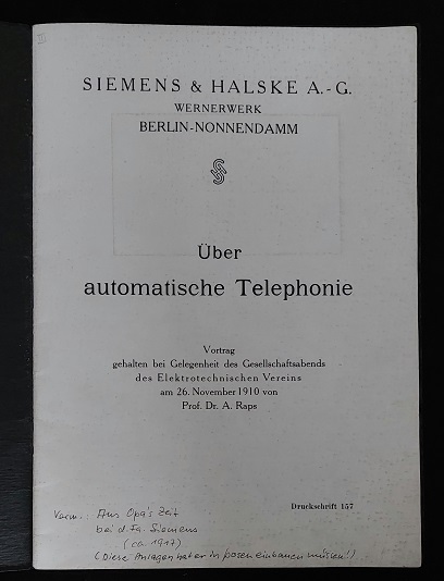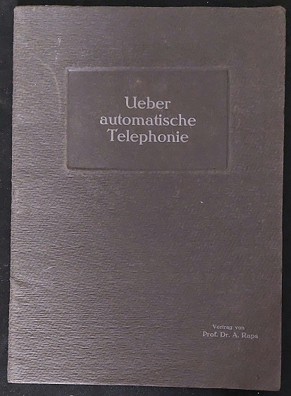 FUNK.– RAPS, August: Über automatische Telephonie. Vortrag gehalten bei Gelegenheit des Gesellschaftabends des Elektrotechnischen Vereins am 26. November 1910. Berlin (Siemens & Halske), 1910. 4°. 30 (1) S. mit 36 Abb. + 1 Falttafel im Anhang. OKart. kaum bestaubt, WaT. = Druckschrift / Siemens & Halske AG, 157. sehr seltene EA aus der Anfangszeit der Telephonie. August Karl Friedrich Agnes Raps (* 23. Januar 1865 in Köln; † 20. April 1920 in Charlottenburg) war ein deutscher Physiker, der die nach ihm benannte Quecksilber-Expansionsluftpumpe Rapssche Pumpe erfand. Im Jahr 1897 wurde ihm die Leitung des Kabelwerks der Firma Siemens an der Franklinstraße in Charlottenburg anvertraut. Raps gehörte von 1900 bis 1919 dem Vorstand der Firma Siemens & Halske an. Nach Erreichen der Funkverständigung über eine größere Entfernung wurde das Konsortium in die „Professor Braun’s Telegraphie Gesellschaft GmbH“ umgewandelt, aus der später die Telefunken AG hervorging. Die Einführung des Selbstwählfernsprechdienstes hat Raps maßgeblich gefördert. (Wikipedia)