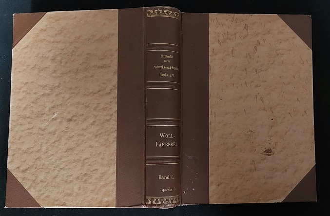 MUSTERBÜCHER.– FARBWERKE VORM. MEISTER LUCIUS & BRÜNING: Die Teerfarbstoffe auf dem Gebie der Wollfärberei. 1. Band. Höchst (Farbwerke vorm. Meister Lucius & Brüning), 1908. 4°. 201 S. mit zwei Frontispizen der Farbwerke und des Hauptbüros sowie 47 Tafeln mit jeweils 16 genauestens beschriebenen Wollstoffproben. OHLdr mit goldgeprägtem Rücken. EA. Farbwerke Hoechst AG, vorm. Meister, Lucius & Brüning – in Frankfurt am Main war eines der drei größten Chemie- und Pharmaunternehmen Deutschlands. Es wurde 1863 im damals nassauischen Höchst am Main gegründet und wuchs bis zum Ersten Weltkrieg zu einem Weltunternehmen. (Wikipedia)