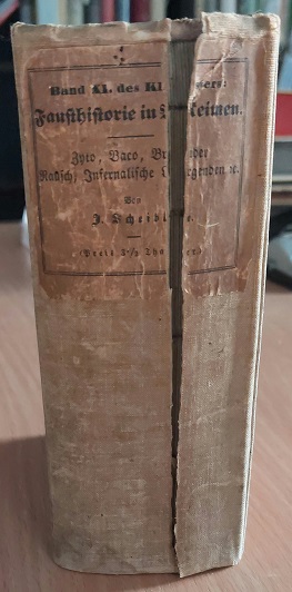 GRENZWISSENSCHAFTEN.– SCHEIBLE, Johann (Hrsg.): Die Geschichte vom Faust in Reimen, nach dem einzigen bekannten Exemplar von 1587 in der Königl. Bibliothek zu Kopenhagen. Die deutschen Volksbücher von Faust und Wagner und die Historien von den Zauberern Baco, Zyto, Bruder Rausch und vielen Andern. Auch vierter Band von „Doctor Johann Faust“. 41 bis 44 Zelle. Stuttgart (Scheible), 1849. 8°. VI S., 4 Bl., 1222 Seiten, 4 Bl. HLn der Zeit mit Rückenschild Rücken mittig durchtrennt, sonst gutes Ex. = Das Kloster : Weltlich und geistlich; Meist aus der ältern deutschen Volks-, Wunder-, Curiositäten-, und vorzugsweise komischen Literatur; Zur Kultur- und Sittengeschichte in Wort und Bild, 11 Bd. EA. Johann Scheible (* 9. Juli 1809 in Ulm; † 15. August 1866 in Stuttgart) war ein deutscher Verleger, Herausgeber und Antiquar.