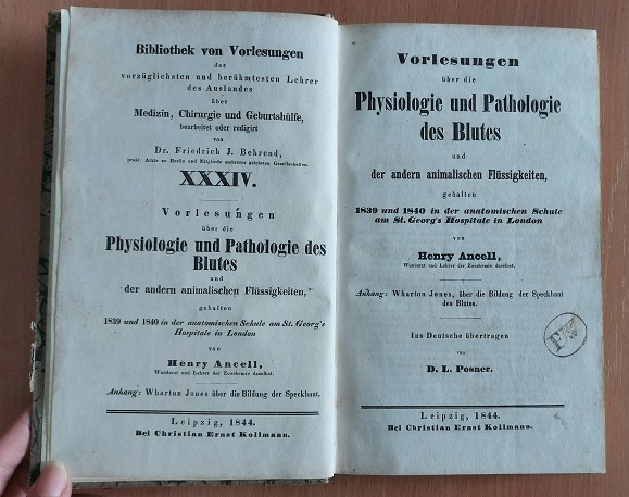 MEDIZIN.– ANCELL, Henry: Vorlesungen über die Physiologie und Pathologie des Blutes und der andern animalischen Flüssigkeiten. Gehalten 1839 und 1840 in der anatomischen Schule am St. Georg’s Hospitale in London. Anhang: Wharton Jones. Über die Bildung der Speckhaut des Blutes. D.v. L. Posner. Leipzig (Kollmann), 1844. 8°. VIII, 488 S. mit dreiseitigem Gelbschnitt. Pb der Zeit. = Bibliothek von Vorlesungen der vorzüglichsten und berühmtesten Lehrer des Auslandes über Medizin, Chirurgie und Geburtshülfe, 34. dt. EA. Britischer Arzt, geboren am 2. Januar 1802 in Croydon; gestorben am 19. November 1863.