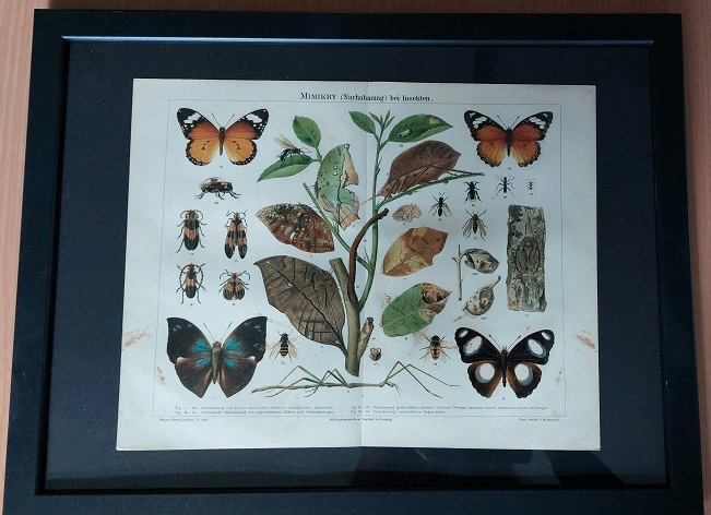 FARBLITHOGRAPHIE.– MIMIKRY (NACHAHMUNG BEI INSEKTEN).– Original Chromolithographie von 1896 in stilvollem Kunstglasrahmen mit schwarzem Rand. Aus: Meyers Konversations Lexikon. 5. Aufl. Leipzig (BI), 1896. Abbildungsgröße 30 x 24 cm. Rahmengröße 43 x 33 cm. Schönes dekoratives Blatt mit Mittelfalz. leicht fleckig, insgesamt gut erhalten – siehe Foto. Mit ca 30 farbigen Abbildungen. Die Chromolithographie ( farbiger Steindruck ) erlebte ihre höchste technische Blüte um 1900. Ihre Farbkraft wird von keinem anderen Druckverfahren erreicht. Der Farbdruck von Steinen wird heute nicht mehr verwendet und darf als eine ausgestorbene, historische Drucktechnik angesehen werden. Die farbigen „Chromos“ gelten heute als kulturgeschichtliche und drucktechnische Kostbarkeiten und sind begehrte Sammlerobjekte.