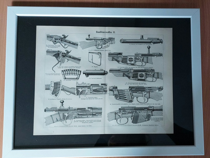HOLZSTICH.– HANDFEUERWAFFEN II.– Original Bildtafel von 1896 in stilvollem Kunstglasrahmen mit weißem Rand. Aus: Meyers Konversations Lexikon. 5. Aufl. Leipzig (BI), 1896. Abbildungsgröße 30 x 24 cm. Rahmengröße 43 x 33 cm. Schönes dekoratives Blatt mit Mittelfalz und 13 Abb. leicht bestaubt, insgesamt gut erhalten – siehe Foto.