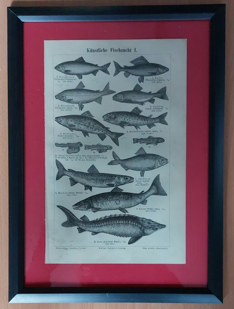 HOLZSTICH.– KÜNSTLICHE FISCHZUCHT I.– Original Bildtafel von 1896 in stilvollem Kunstglasrahmen mit schwarzem Rand. Aus: Meyers Konversations Lexikon. 5. Aufl. Leipzig (BI), 1896. Abbildungsgröße 24 x 15,5 cm. Rahmengröße 31,5 x 23 cm. Schönes dekoratives Blatt mit Mittelfalz und zahlr. Abb. leicht bestaubt, insgesamt gut erhalten – siehe Foto. Mit Äsche, Blaufelchen, Saibling, Whitefisch, Bachforelle, Seeforelle, Barschforelle, Huchen, Lachs, Stör etc.