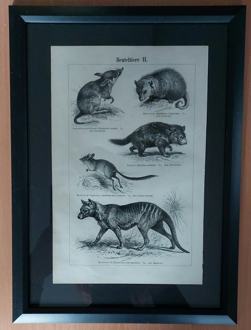 HOLZSTICH.– BEUTELTIERE II.– Original Bildtafel von 1896 in stilvollem Kunstglasrahmen mit schwarzem Rand. Aus: Meyers Konversations Lexikon. 5. Aufl. Leipzig (BI), 1896. Abbildungsgröße 24 x 15,5 cm. Rahmengröße 31,5 x 23 cm. Schönes dekoratives Blatt mit Mittelfalz und zahlr. Abb. leicht bestaubt, insgesamt gut erhalten – siehe Foto. Mit Nasenbeuteldachs, Opossum, Teufel, Beutelspringmaus, Beutelwolf.