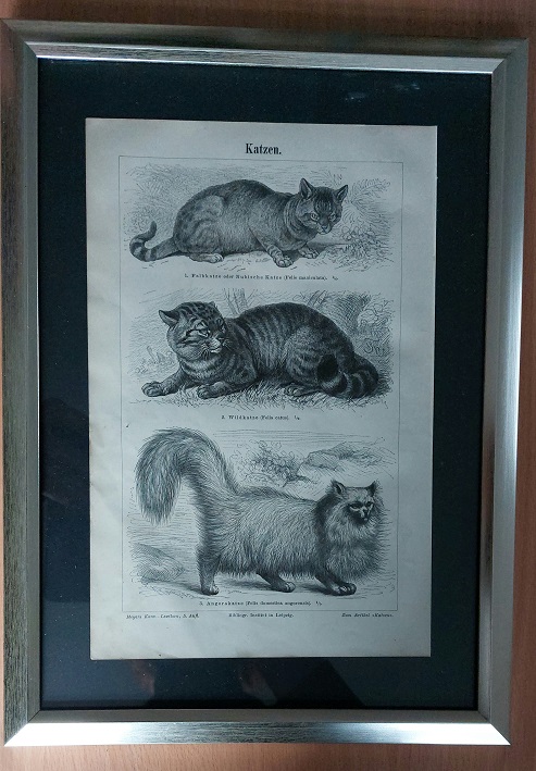 HOLZSTICH.– KATZEN.– Original Bildtafel von 1896 in stilvollem Kunstglasrahmen mit silbernem Rand. Aus: Meyers Konversations Lexikon. 5. Aufl. Leipzig (BI), 1896. Abbildungsgröße 24 x 15,5 cm. Rahmengröße 31,5 x 23 cm. Schönes dekoratives Blatt mit Mittelfalz und zahlr. Abb. leicht bestaubt, insgesamt gut erhalten – siehe Foto. Zeigt Falbkatze, Wildkatze, Angorakatze.