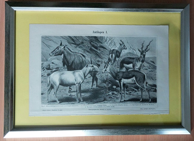 HOLZSTICH.– ANTILOPEN I.– Original Bildtafel von 1896 in stilvollem Kunstglasrahmen mit silbernem Rand. Aus: Meyers Konversations Lexikon. 5. Aufl. Leipzig (BI), 1896. Abbildungsgröße 24 x 15,5 cm. Rahmengröße 31,5 x 23 cm. Schönes dekoratives Blatt. leicht bestaubt, insgesamt gut erhalten – siehe Foto. Zeigt Hirschziegenantilope, Steppenantilope, Gazelle, Springbock, Nylgau von dem bedeutenden Tiermaler Wilhelm Kuhnert (1865 – 1926), der seine tierischen Motive in der freien Natur und nicht in Zoologischen Gärten studierte.