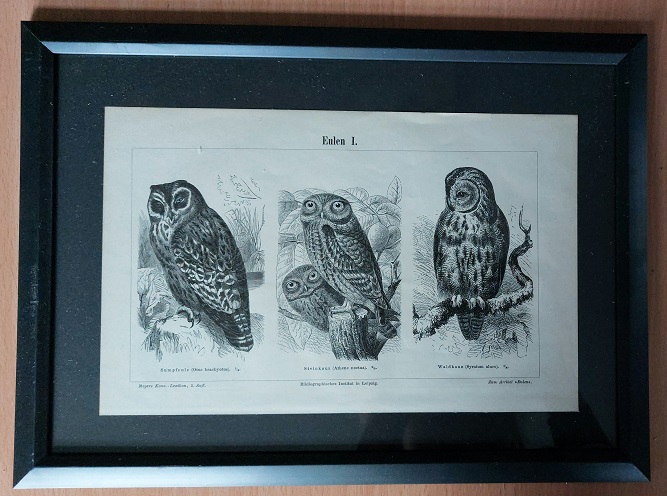 HOLZSTICH.– EULEN I.– Original Bildtafel von 1896 in stilvollem Kunstglasrahmen mit schwarzem Rand. Aus: Meyers Konversations Lexikon. 5. Aufl. Leipzig (BI), 1896. Abbildungsgröße 24 x 15,5 cm. Rahmengröße 31,5 x 23 cm. Schönes dekoratives Blatt. leicht bestaubt, insgesamt gut erhalten – siehe Foto. Sumpfeule, Steinkauz, Waldkauz.