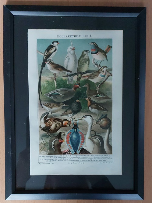 FARBLITHOGRAPHIE.– HOCHZEITSKLEIDER I. (ORNITHOLOGIE) .– Original farbige Bildtafel von 1896 in stilvollem Kunstglasrahmen mit schwarzem Rand. Aus: Meyers Konversations Lexikon. 5. Aufl. Leipzig (BI), 1896. Abbildungsgröße 24 x 15,5 cm. Rahmengröße 31,5 x 23 cm. Schönes dekoratives Blatt. kaum bestaubt, insgesamt gut erhalten – siehe Foto. Gehörnter Glockenvogel, Blaukehlchen, Dominikan er Witwe, Krikente, Kampfläufer, Goldschnepfe, Präriehuhn etc.