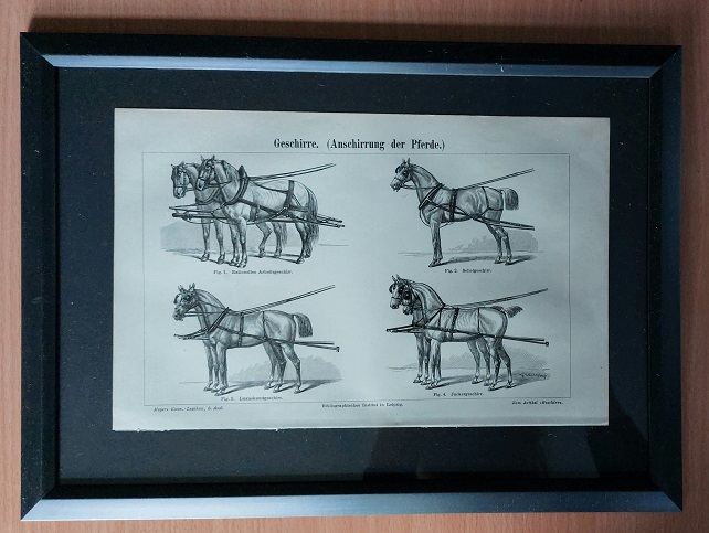 HOLZSTICH.– GESCHIRRE (ANSCHIRRUNG DER PFERDE).– Original Bildtafel von 1896 in stilvollem Kunstglasrahmen mit schwarzem Rand. Aus: Meyers Konversations Lexikon. 5. Aufl. Leipzig (BI), 1896. Abbildungsgröße 24 x 15,5 cm. Rahmengröße 31,5 x 23 cm. Schönes dekoratives Blatt. leicht bestaubt, insgesamt gut erhalten – siehe Foto. Arbeitsgeschirr, Selletgeschirr, Luxuskunstgeschirr, Junckergeschirr.