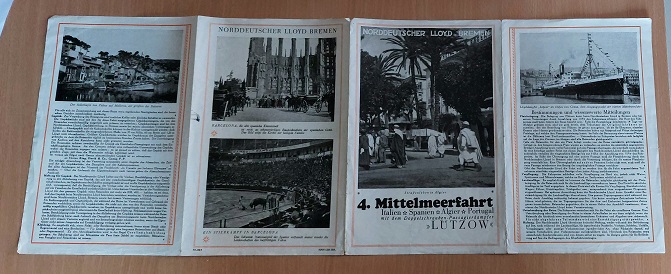 SCHIFFAHRT.– NORDDEUTSCHER LLOYD BREMEN.– Faltblatt des Doppelschrauben-Passagierdampfers „LÜTZOW“ von 1927. 4. Mittelmeerfahrt. Bremen (NDL), 1927. Gr. 8°. 4-Blatt-Leporello mit Plan der Lützow und zahlr. Bildern wie z.B. Straßenleben in Algier. leicht fleckig, sonst gutes Ex. Der Reichspostdampfer Lützow war das zehnte Schiff der Feldherren-Klasse des Norddeutschen Lloyd (NDL) für den Dienst nach Ostasien und Australien. Das Schiff war benannt nach dem preußischen Generalmajor Ludwig Adolf Wilhelm von Lützow (1782–1834), dem Kommandeur der „Schwarzen Jäger“. Die 1914 von den Briten im Sueskanal beschlagnahmte Lützow wurde 1923 vom NDL zurückgekauft und bis 1932 auf dem Nordatlantik und zu Kreuzfahrten eingesetzt. Sie war das erste Schiff, das ein Flugzeug mit sich führte, um seinen Passagieren Rundflüge anzubieten. (…) Nach Reparatur und Umbau mit 8716 BRT vermessen, verfügte die Lützow über Einrichtungen für 820 Passagiere nur in der II. und III. Klasse. Am 14. Juni 1924 trat sie ihre erste Nachkriegsreise für den NDL nach New York an. Auch nach Kanada wurde sie eingesetzt. Im Juni 1925 führte sie erstmals drei Nordland-Kreuzfahrten durch. 1926 folgten fünf Mittelmeer-Kreuzfahrten ab dem 12. Februar: Die Lützow lief von Bremerhaven rund um Spanien in 16 Tagen nach Genua, von dort ging die zweite Reise in 15 Tagen über neun Zwischenhäfen nach Venedig und die dritte Reise von dort in 26 Tagen über Griechenland bis Konstantinopel, über Palästina nach Alexandria und zurück nach Venedig. Die vierte und fünfte Reise wiederholten die beiden ersten in umgekehrter Richtung. 1927 standen Mittelmeer- und Nordlandfahrten, aber auch eine Ostsee-/Skandinavien-Kreuzfahrt auf dem Programm; bis 1931 waren es insgesamt 17 Kreuzfahrten.