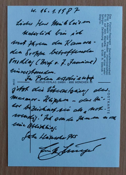 JÜNGER, Ernst: 15zeilige eigenhändige voll signierte und datierte Farb-Postkarte an Horst Mühleisen. „Natürlich bin ich mit Ihrem den Kameraden Groppe betreffenden Vorschlag einverstanden. In Polen erschien jetzt die Übersetzung der Marmor-Klippen – der Autor bezeichnet sie als „notwendig“. Ich sende Ihnen noch eine Ablichtung.“ o.O. 16.1.1987. Bildpostkarte – Motiv: das 73. Füsilier-Regiment nach einer farb. Zeichnung von Döbrich. nicht gelaufen, keine Marke. gutes Ex. Interessante Informationen zu Groppe und Auf den Marmorklippen. Theodor Groppe, auch der Schwarze General genannt, (* 16. August 1882 in Trier; † 28. April 1973 ebenda) war ein deutscher Generalleutnant im Zweiten Weltkrieg. Aufgrund seiner regimekritischen Haltung wurde er 1933 und Ende 1941 aus der Wehrmacht entlassen. Im Erzählwerk Auf den Marmorklippen gilt als typisch für Jüngers Ästhetizismus, der der Vernichtung Gelassenheit oder innere Emigration gegenüberstellt. (Wikipedia)