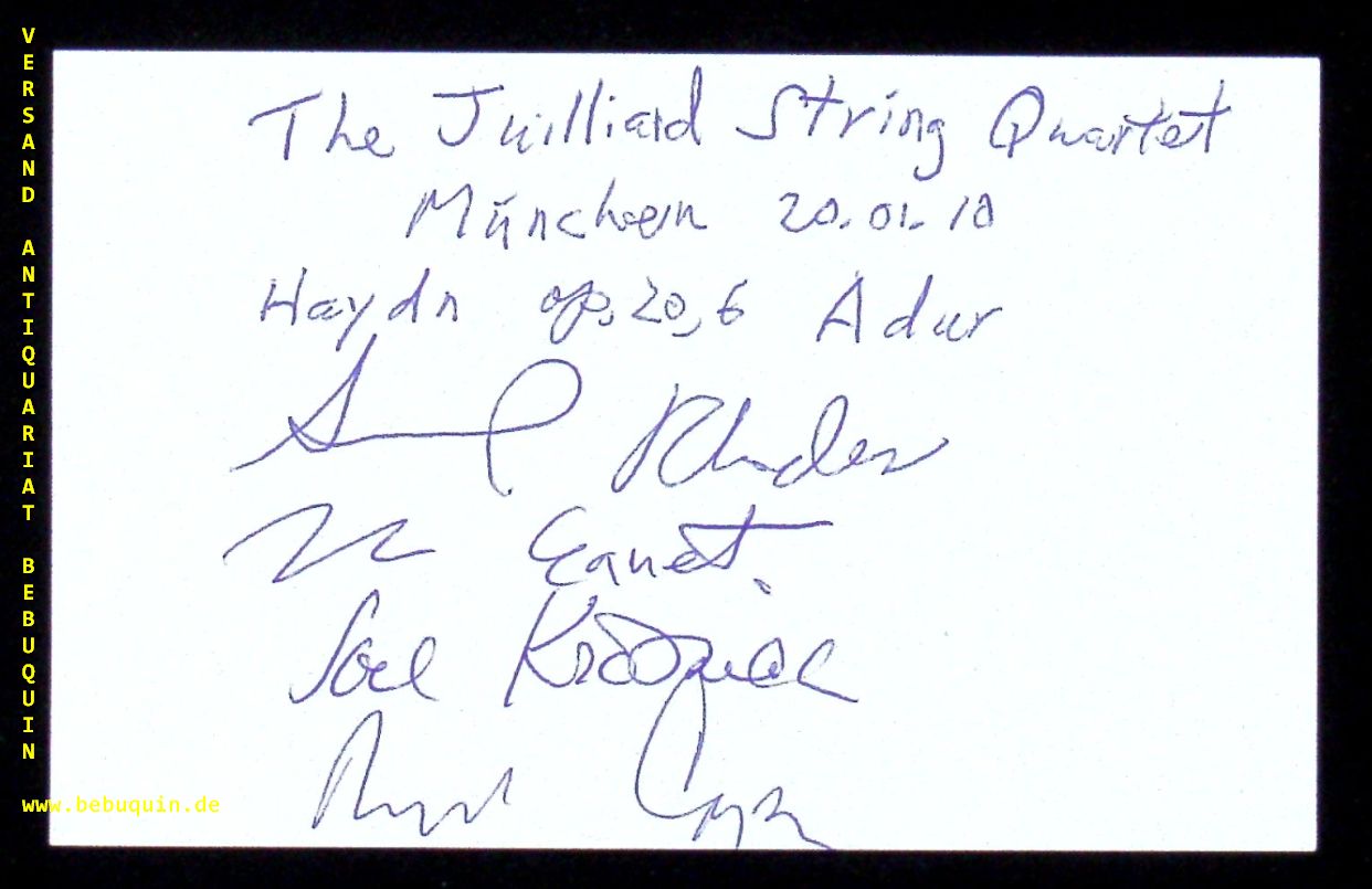 JUILLARD STRING QUARTET.– EANET, Nick + COPES, Ronald + RHODES, Samuel + KROSNICK, Joel: eigenhändig von allen signierte und datierte Autogrammkarte. München (Philharmonie), 20.1.2010. 8 x 12,5 cm. Karteikarte. Das Juilliard String Quartet gehört seit 1947, dem Jahr seines ersten Auftretens, zu den führenden Streichquartettensembles der Welt. Mit über 100 Veröffentlichungen ist das Juilliard String Quartet eines der am meisten aufgenommenen Streichquartettensembles der Welt und konnte bislang vier Grammys gewinnen. (Wikipedia)