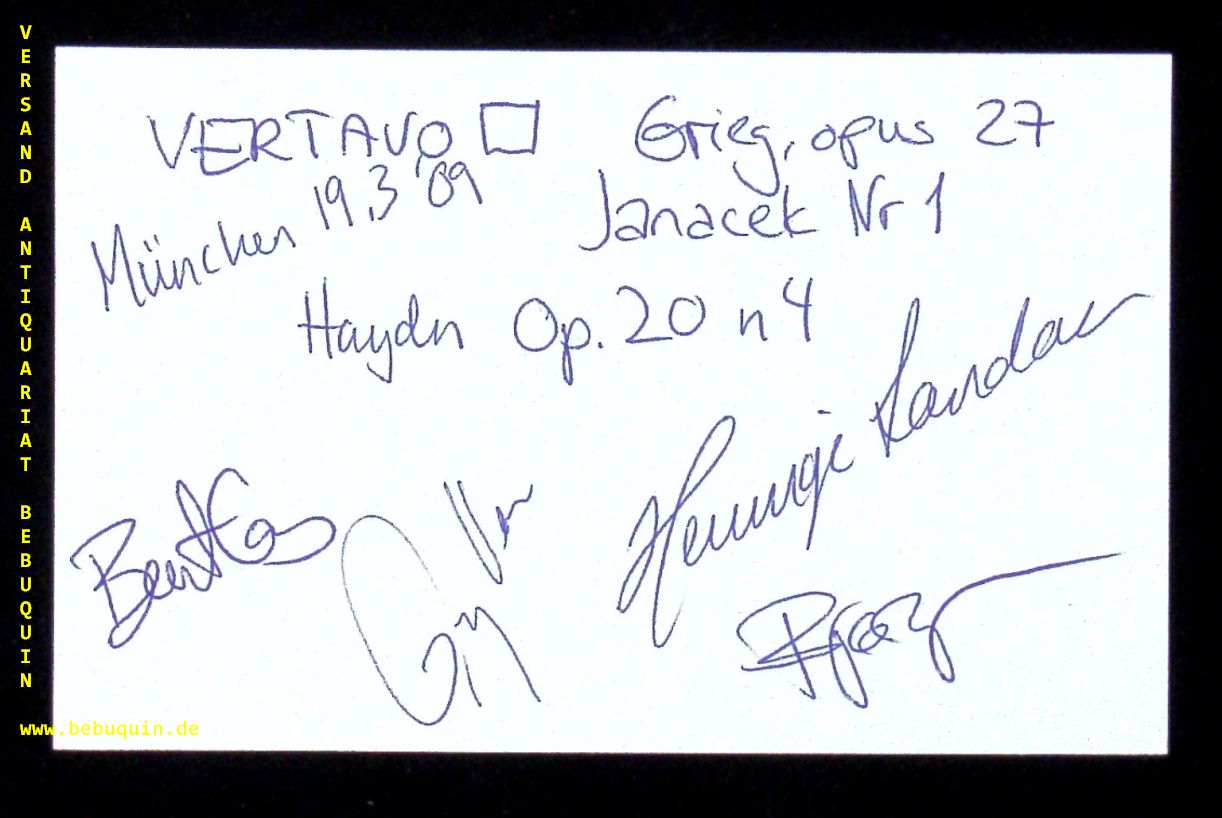 VERTAVO QUARTET.– VOLLE, Öyvor + CARDAS, Berit + LANDAAS, Henninge + LEWIS, Björg: eigenhändig von allen signierte und datierte Autogrammkarte. München (Herkulessaal), 19.3.1989. 8 x 12,5 cm. Karteikarte. Vertavo String Quartet is a Norwegian group founded in Hamar in 1984. (Wikipedia)