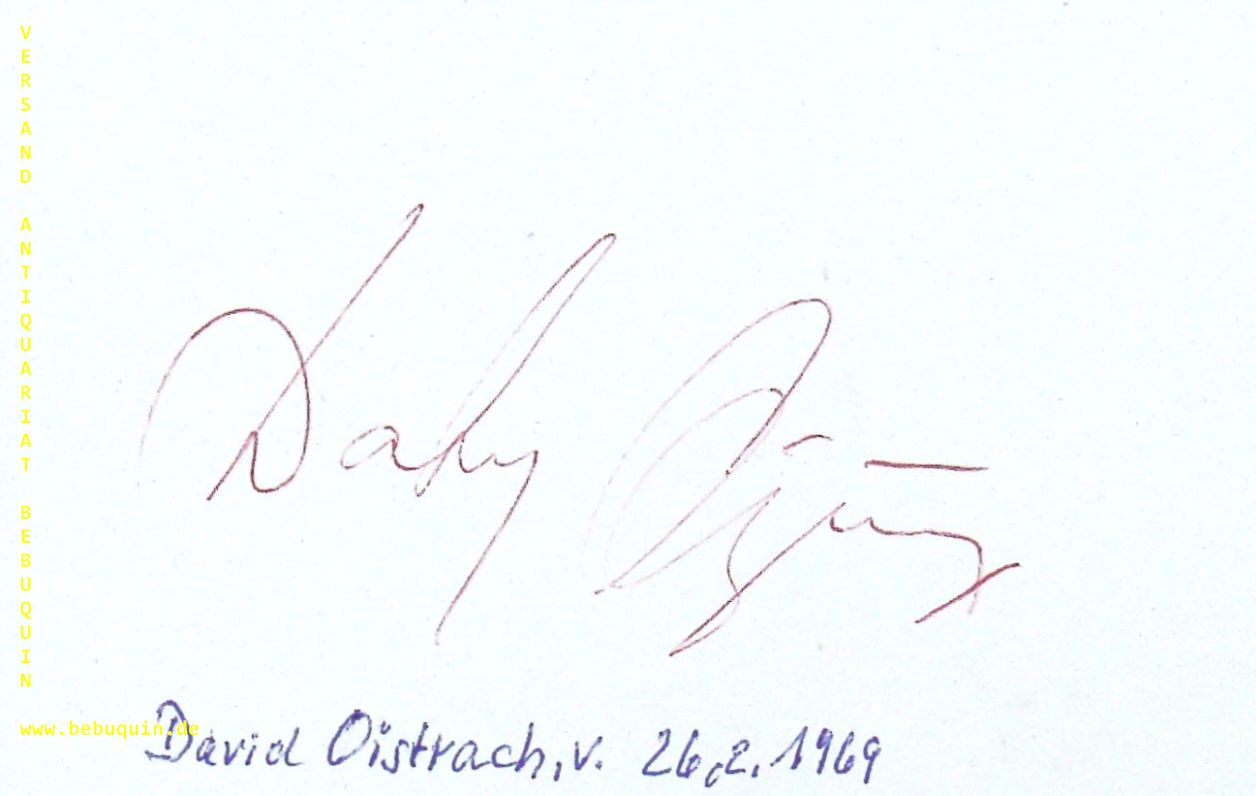 OISTRACH, David (Violinist) + BAUER, Frieda (Pianistin): eigenhändig signierte (auf der Vorder- bzw. Rückseite) Autogrammkarten. München (Kongresssaal), 26.2.1969. 8 x 12,5 cm. Karteikarte. Dawid Fjodorowitsch Oistrach (Eustrach) (* 17. Septemberjul./ 30. September 1908greg. in Odessa; † 24. Oktober 1974 in Amsterdam) war ein sowjetischer Geiger jüdischer Abstammung, der in der Musikwelt des 20. Jahrhunderts eine bedeutende Rolle spielte. (Wikipedia)