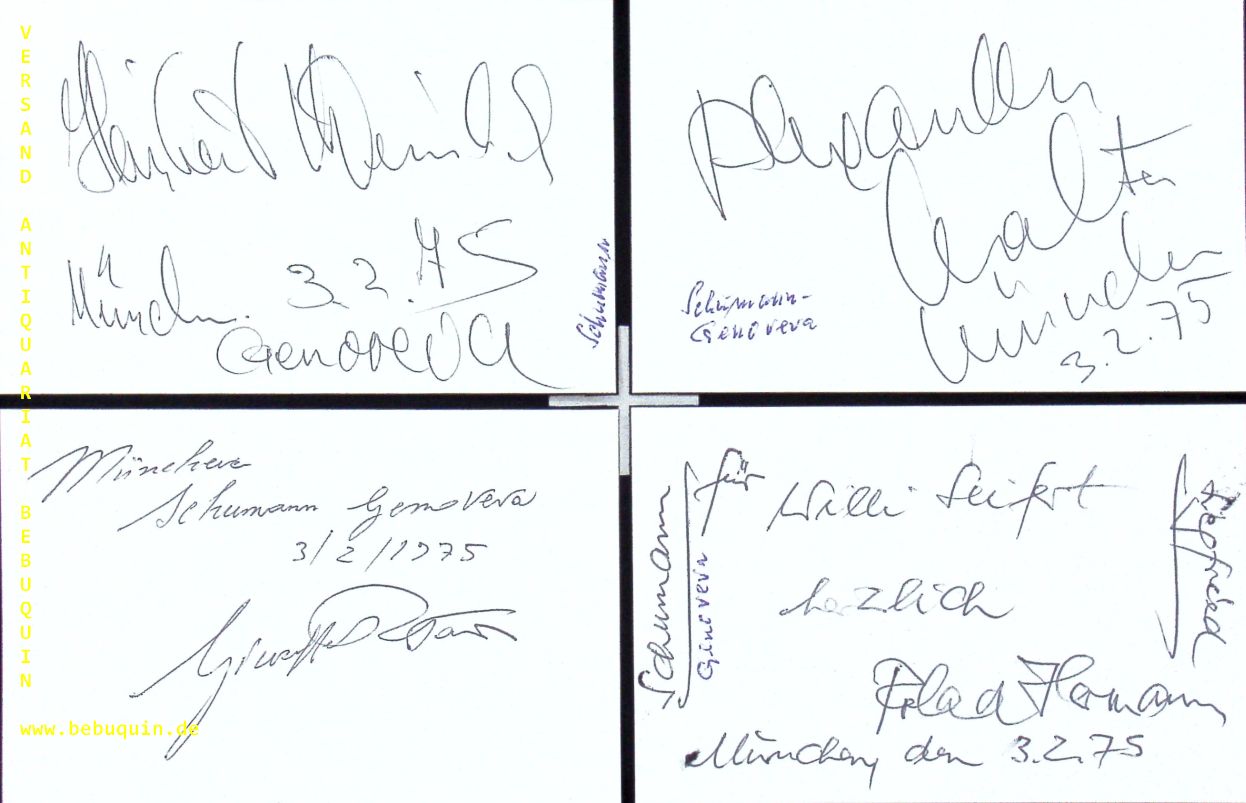 SCHUMANN GENOVEVA (OPER).– PATANE, Giuseppe (Dirigent) + POPP, Lucia + HOLL, Robert + WAGEMANN, Rose + MALTA, Alexander + TSCHAMMER, Hans + HERMANN, Roland + STEINBACH, Heribert: 9 eigenhändig von allen jeweils einzeln siognierte und datierte Autogrammkarten. München (Herkulessaal), 3.2.1975. 8 x 12,5 cm. Karteikarten. Genoveva op. 81 ist die einzige Oper von Robert Schumann, der zwischen April 1847 und August 1848 sowohl die Musik komponierte als auch den Text schrieb. Am 25. Juni 1850 wurde sie im Stadttheater Leipzig unter der Leitung des Komponisten uraufgeführt. (Wikipedia)