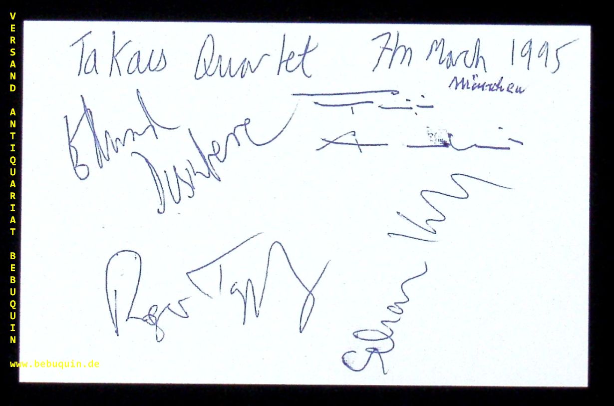 TAKACS QUARTETT.– DUSINBERRE, Edward + SCHRANZ, Karoly + TAPPING, Roger + FEJER, Andras: eigenhändig von allen vier Künstlern signierte und datierte Autogrammkarte. München (Philharmonie), 7.3.1995. 8 x 12,5 cm. Karteikarten. The Takács Quartet is a string quartet, founded in Hungary, and now based in Boulder, Colorado, United States. (Wikipedia)