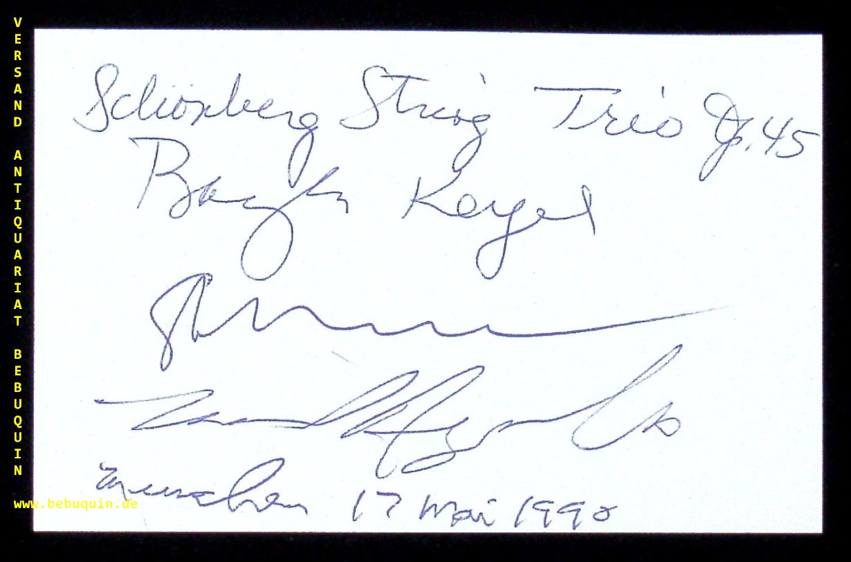 SCHÖNBERG STRING TRIO.– ANSELL, Steven (Bratschist) + KEYES, Bayla (Violinistin) + REYNOLDS, Michael (Cellist): Eigenhändig von allen signierte Autogrammkarte. München (Philharmonie), 17.5.1990. 8 x 12,5 cm. Karteikarte.