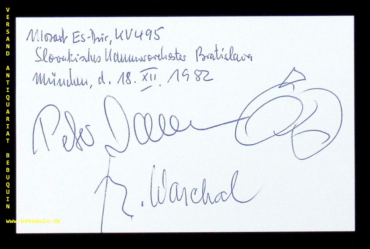 WARCHAL, Bagdan (Violinist) + DAMM, Peter (Hornist): eigenhändig von beiden signierte und datierte Autogrammkarte. München, 18.12.1982. 8 x 12,5 cm. Karteikarte. Bohdan Warchal (* 27. Januar 1930 in Orlová, Tschechoslowakei; † 30. Dezember 2000 in Bratislava, Slowakei) war ein slowakischer Violinist, Mitglied des Slowakischen Philharmonischen Orchesters sowie Leiter und Solist des Slowakischen Kammerorchesters. (Wikipedia)
