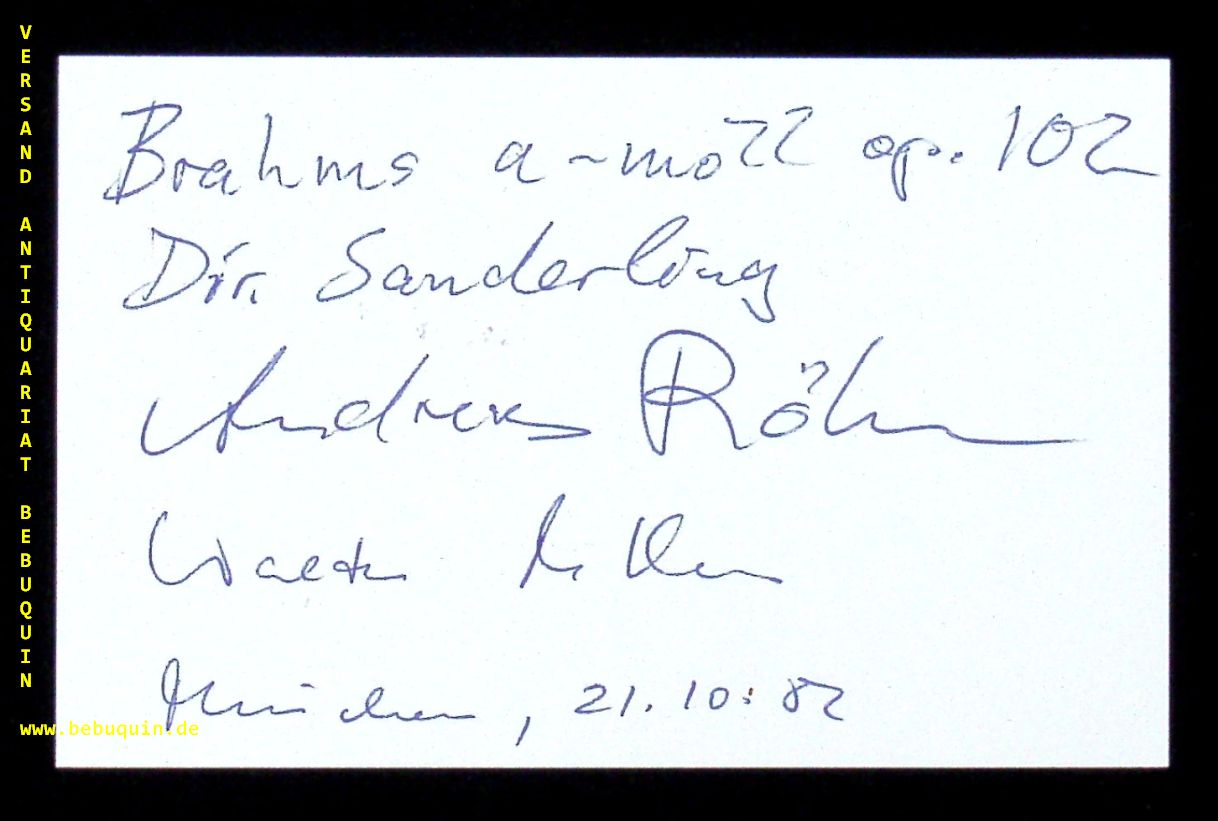 NOTHAS, Walter (Cellist) + RÖHN, Andreas (Violinist): eigenhändig von beiden signierte und datierte Autogrammkarte. München (Philharmonie), 21.10.1982. 8 x 12,5 cm. Karteikarte. Andreas Röhn war 28 Jahre lang Erster Konzertmeister im Symphonieorchester des Bayerischen Rundfunks, und ist Professor für Violine an der Staatlichen Musikhochschule in Hamburg. Nothas, Walter (* 23. Juni 1938 Deggendorf) (Wikipedia)